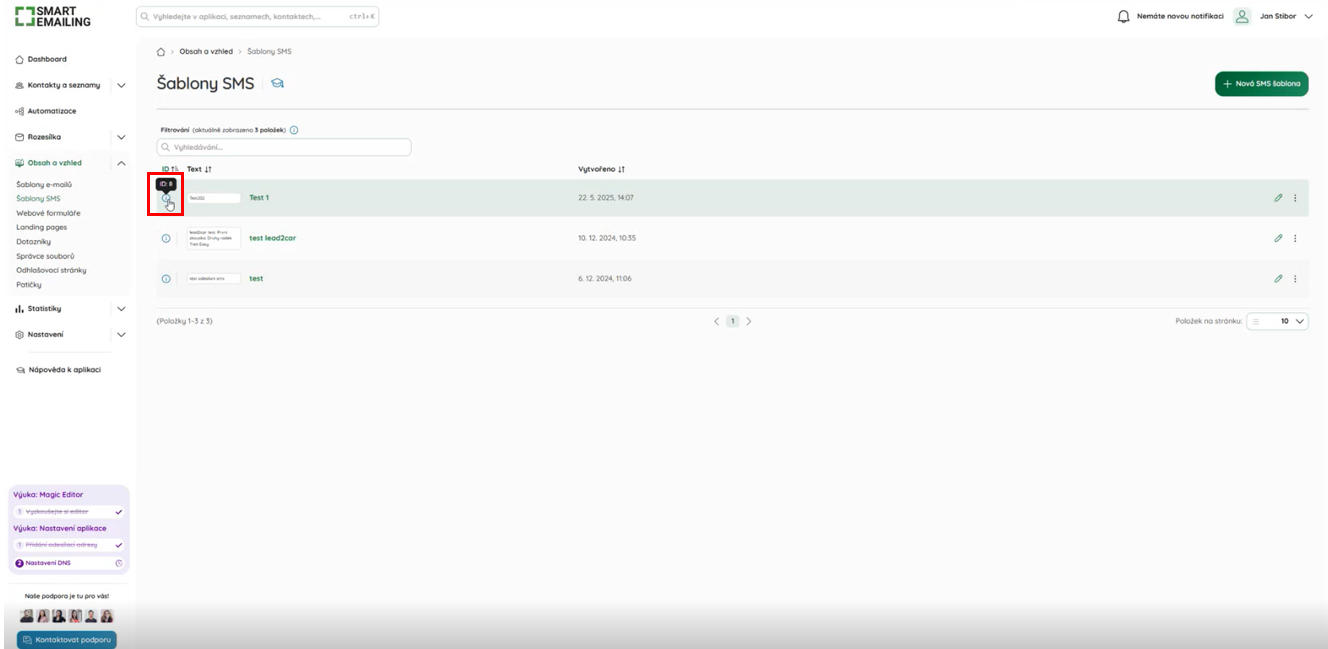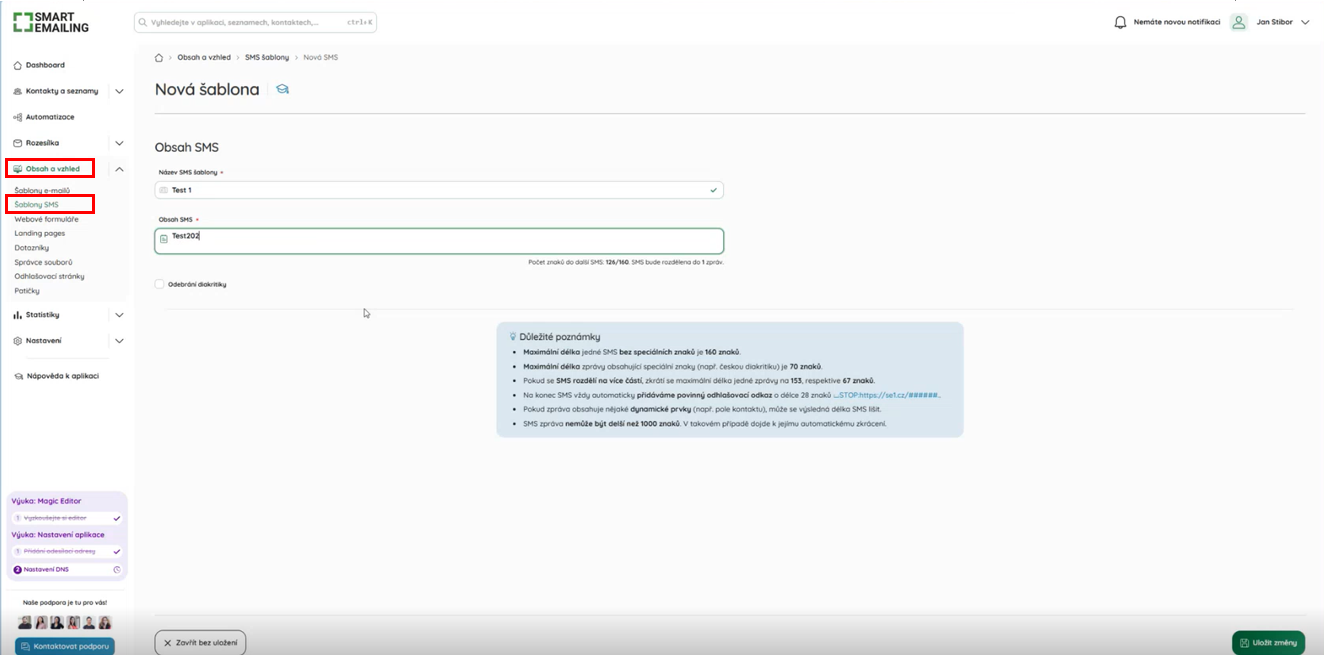Nejprve je třeba připravit samotnou SMS šablonu přímo v rozhraní SmartEmailing. Po přihlášení do SE přejděte do sekce Obsah a vzhled > Šablony SMS a klikněte na Nová SMS šablona.