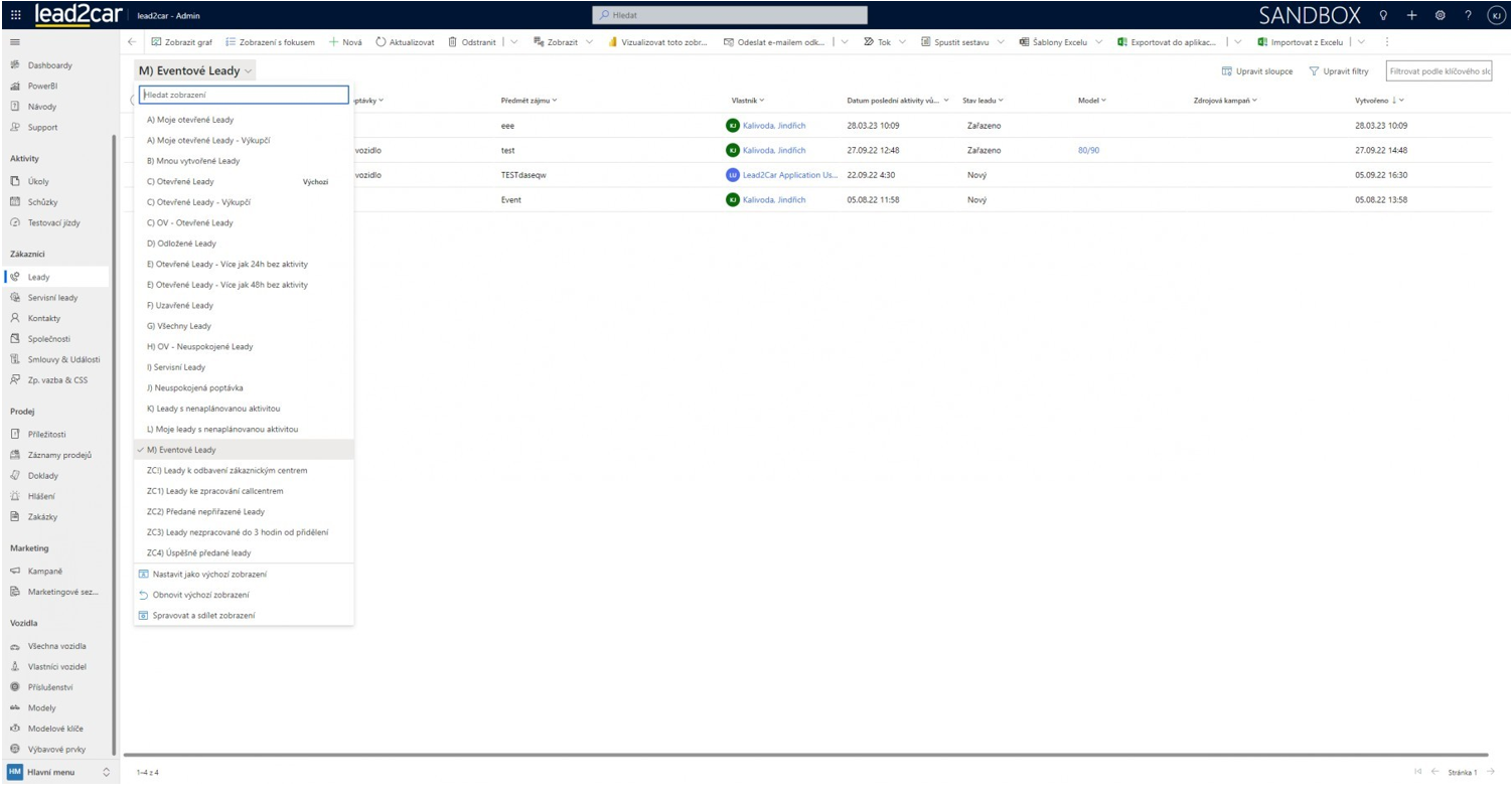 Vzhledem k tomu, že leadů z eventů může být větší množství, je pro ně vytvořeno v rámci filtrů zobrazení leadů speciální zobrazení „Eventové leady“. Toto zobrazení je označeno písmenem M) v lead2car: