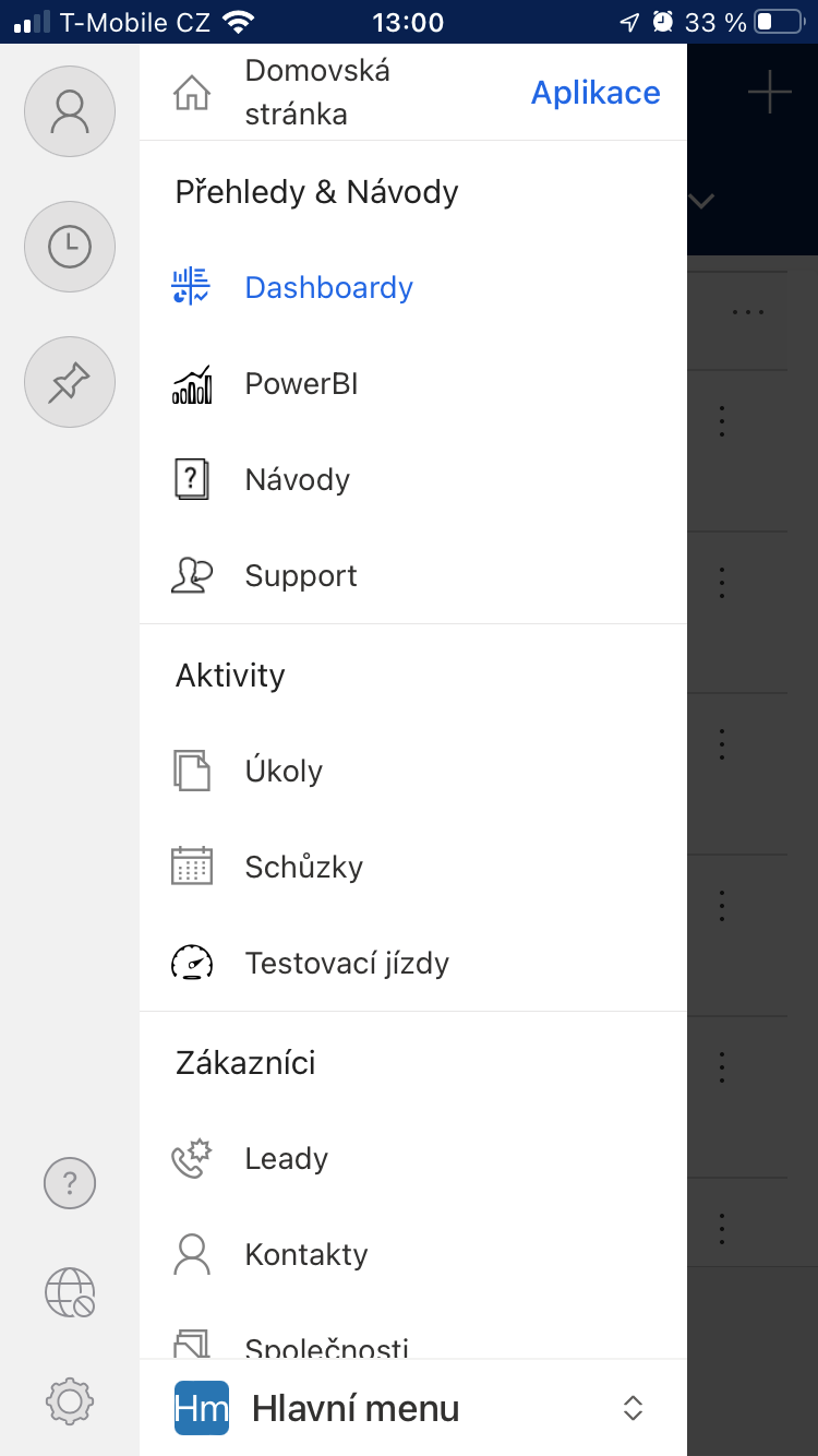 Následně už se ocitnete v mobilním prostředí Lead2car. Základní menu si otevřete pomocí tlačítka v levém horním rohu. Aplikaci můžete využívat stejným způsobem jako základní počítačovou verzi.