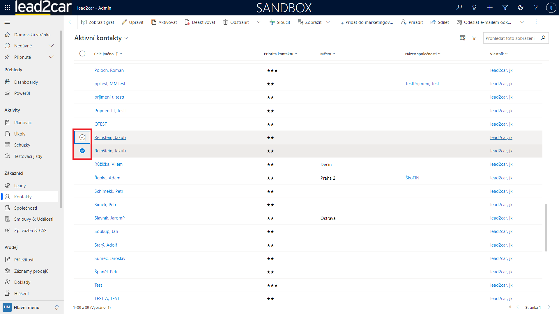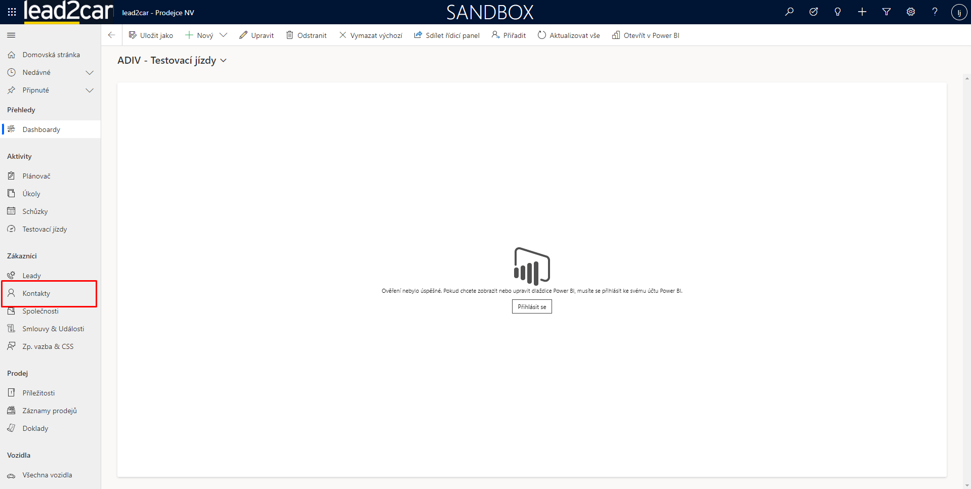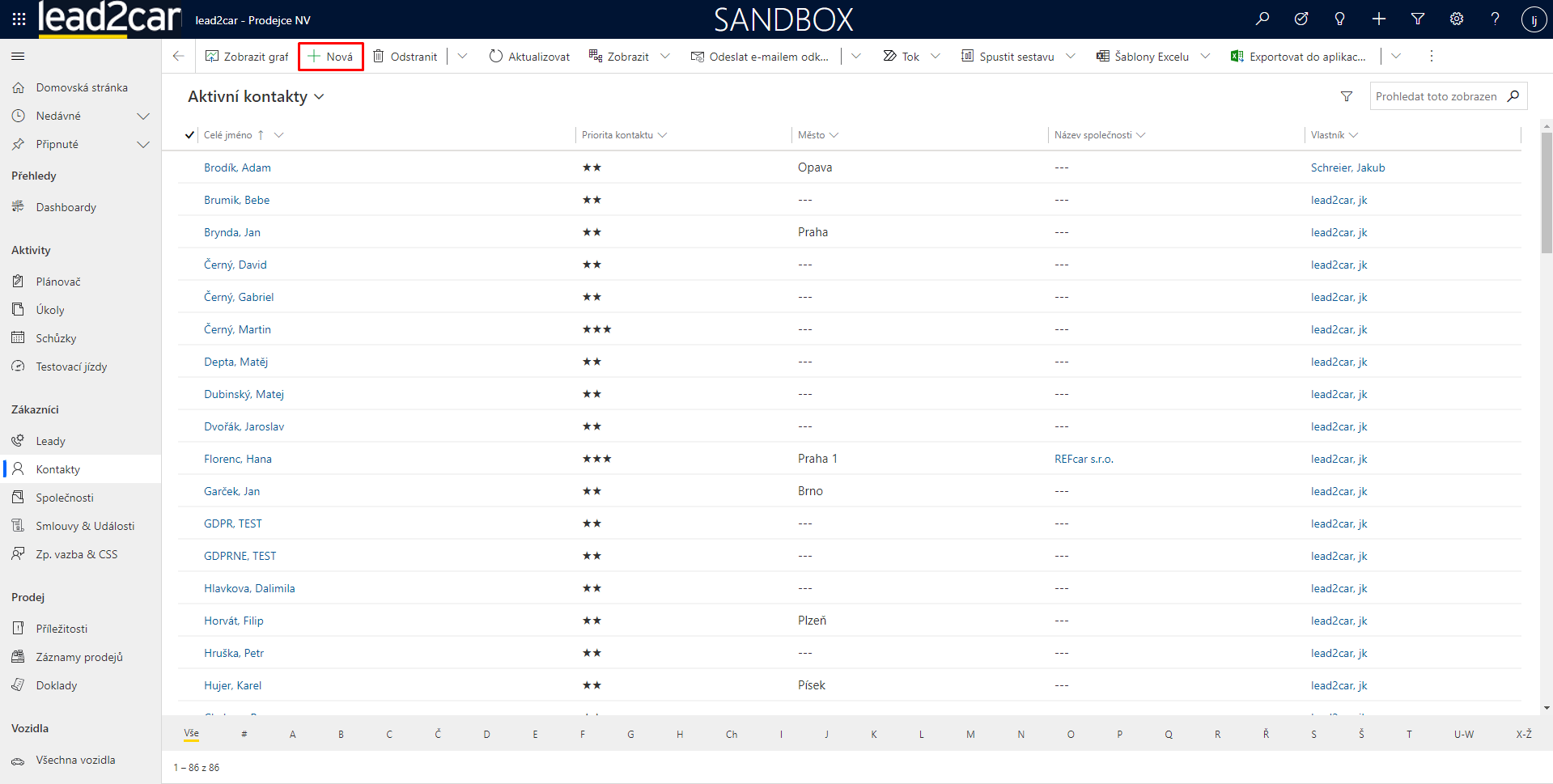 Kontakty se v Lead2Car ukládají ručně. Pro vytvoření kontaktu vyberte z levého menu možnost "Kontakty". Následně se zobrazí celý seznam stávajících kontaktů.