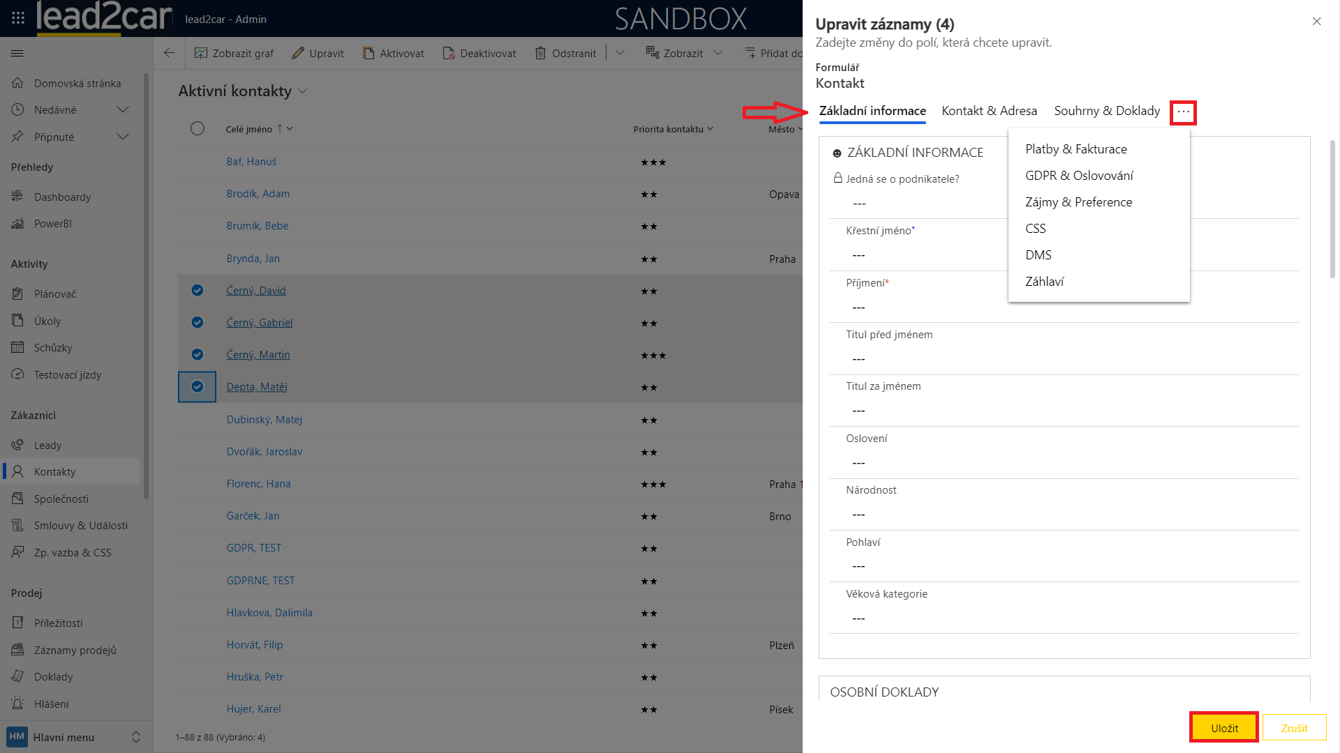 V pravé části obrazovky se zobrazí karta s políčky pro úpravu. V horní části jsou jednotlivé sekce záznamu, na které lze přejít, a následně v nich informace upravit. Po kliknutí na tři tečky vpravo se zobrazí výběr se zbylými kartami. Některá pole mohou být zamčena a nelze je upravovat. Po zapsání změn klikněte na tlačítko "Uložit" v dolní části.