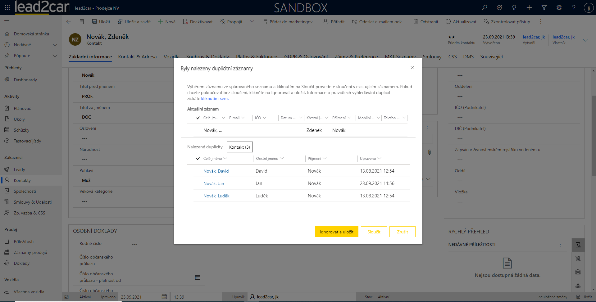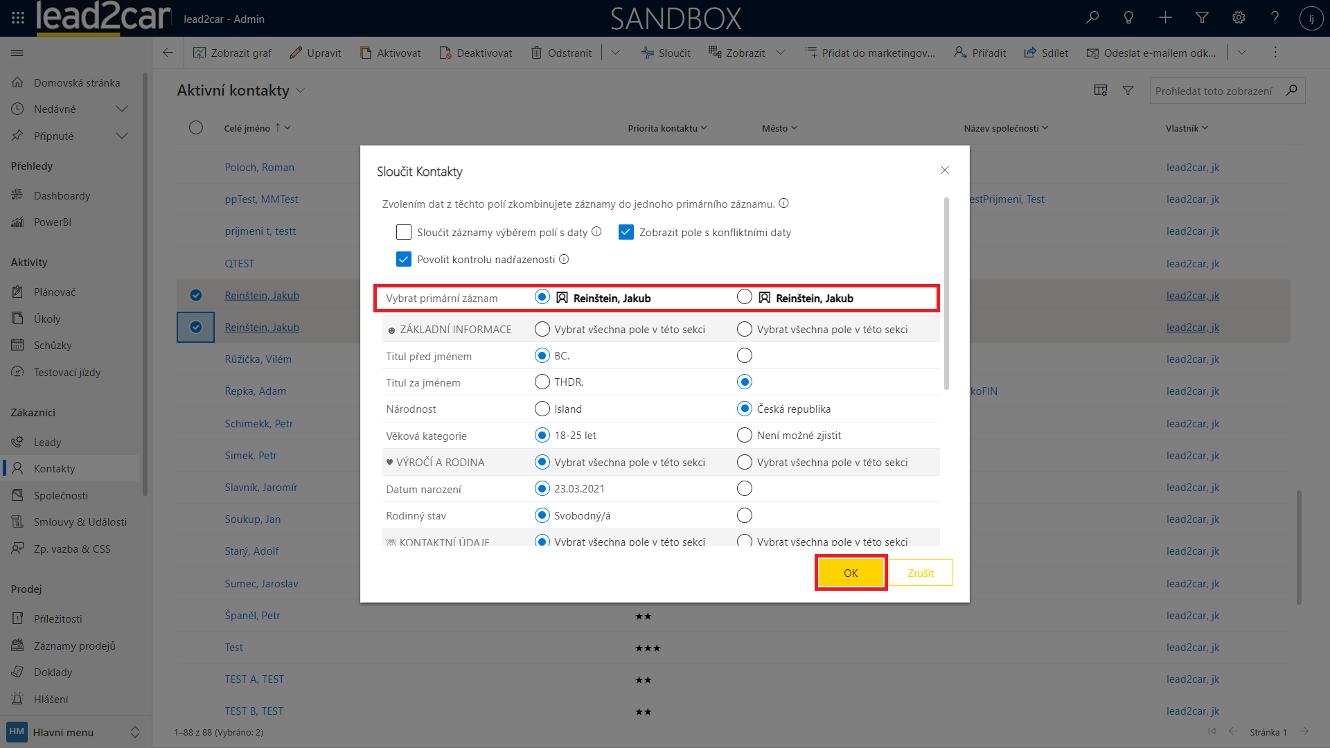 V zobrazeném okně vyberte, které detaily záznamů se mají ve sloučeném kontaktu zachovat. V řádku "Vybrat primární záznam" vyberte ten záznam, který bude zachován a případně upravení podle zvolených nastavení. Druhý, podřízený záznam se po sloučení deaktivuje. Po zvolení detailů sloučeného kontaktu klikněte na tlačítko "OK" pro vytvoření záznamu.