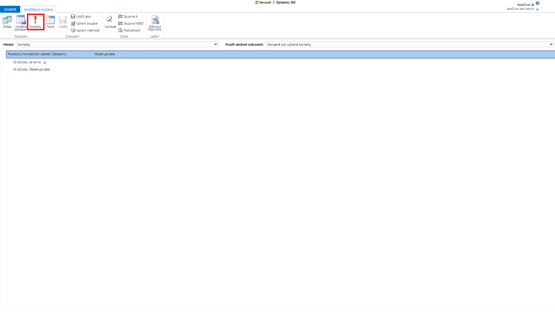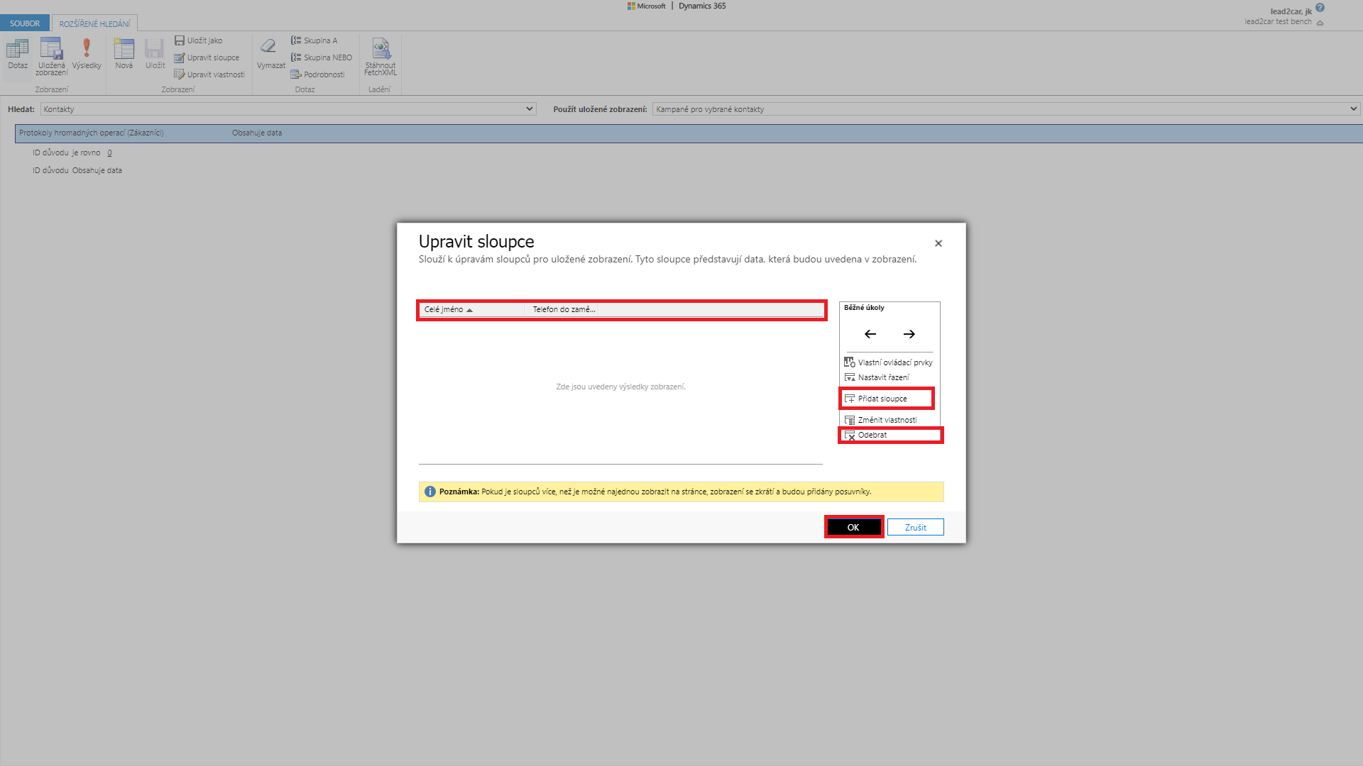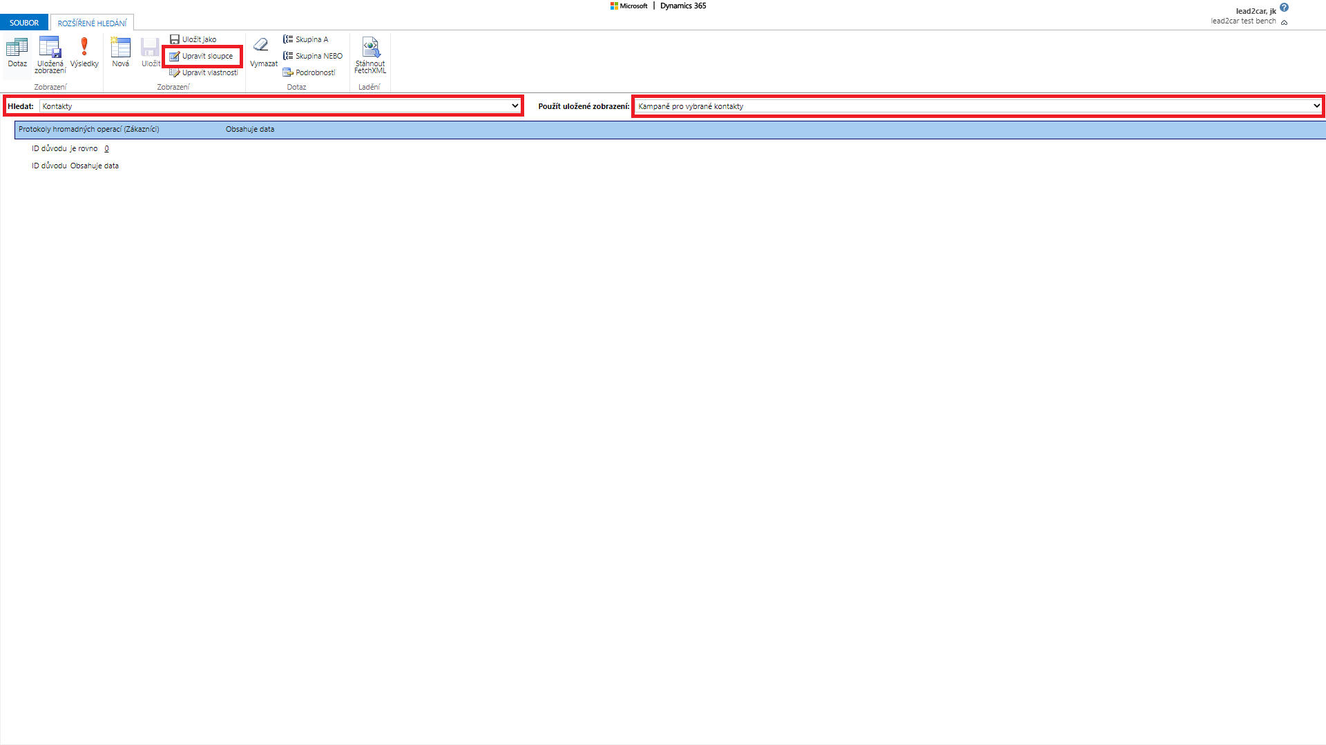 Zobrazí se Vám okno, kde specifikujete, o jaké záznamy máte zájem. Nejprve v poli „Hledat“ vyberte entitu, ze které chcete získat záznamy. Poté zvolte v poli „Použít uložené zobrazení“ zobrazení z této entity, které vás zajímá. Dále můžete specifikovat podmínky podobně jako při filtrování záznamů. Zvolíte pole z Vámi vybrané entity a vyberete jaké vlastnosti by mělo mít. Další podmínky přidáváte pomocí tlačítka „Select“. Pokud kliknete na pole „Upravit sloupce“ kde můžete upravit jaké pole chcete zobrazit ve sloupcích.