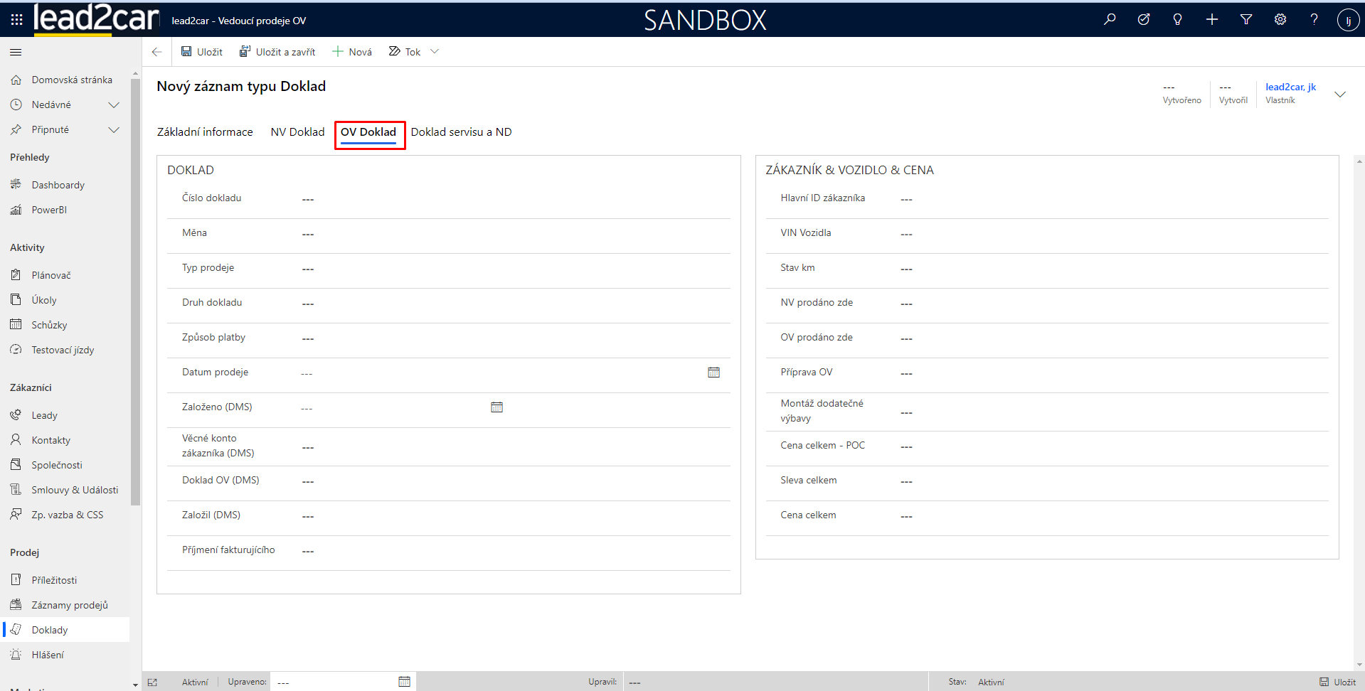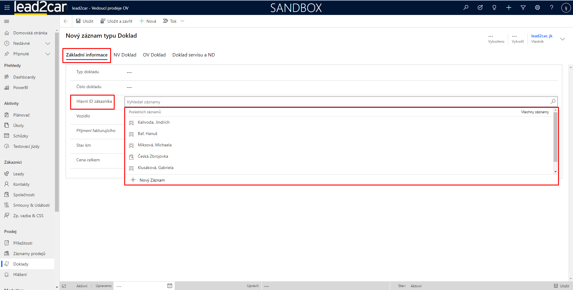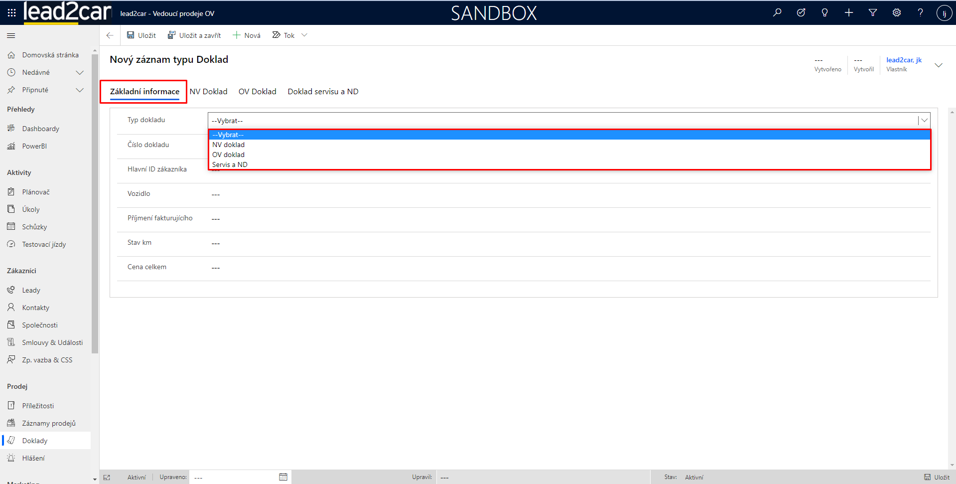 Nejdříve je třeba vyplnit, zda se jedná o doklad k novému vozidlu, ojetému vozidlu nebo servisu. Doklad bude také vázaný na konkrétního zákazníka, proto je třeba jej zvolit.