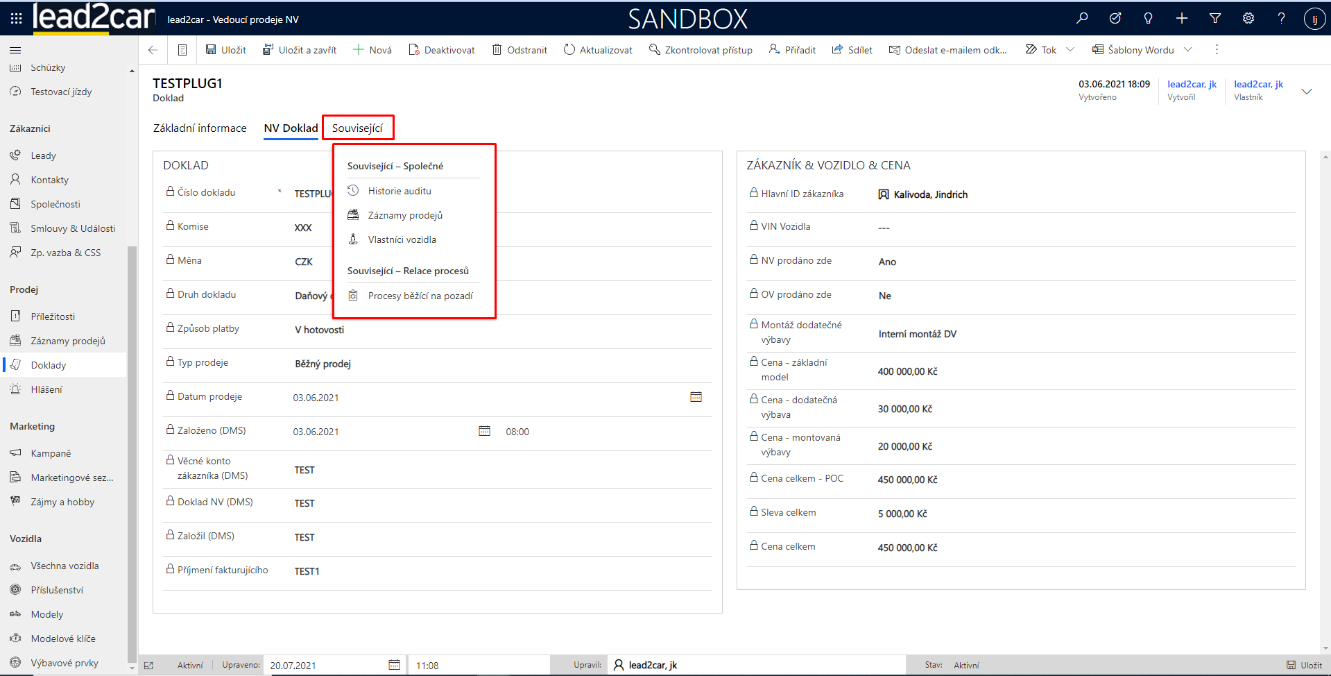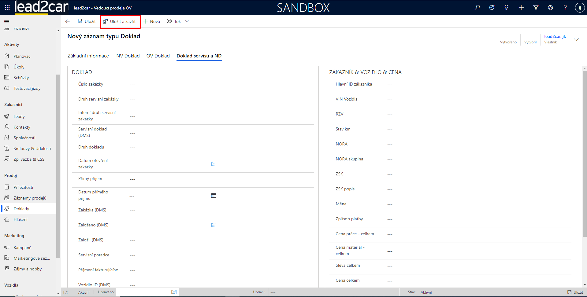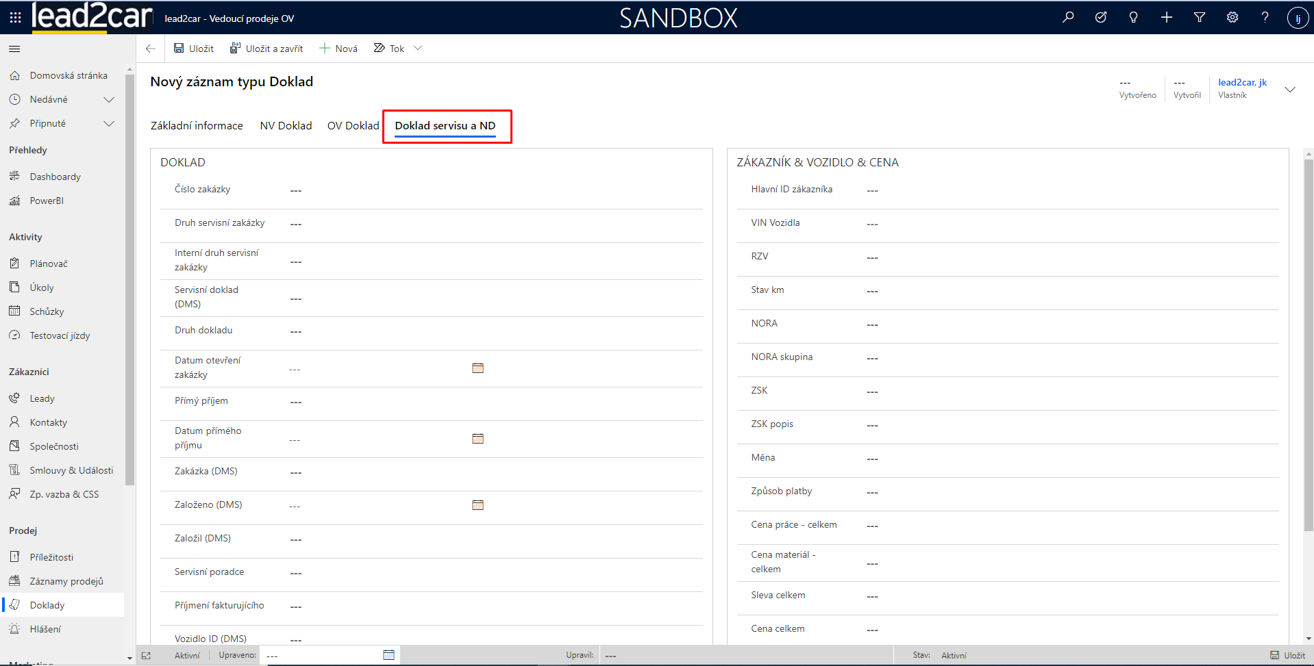 Nejdříve je třeba vyplnit, zda se jedná o doklad k novému vozidlu, ojetému vozidlu nebo servisu. Doklad bude také vázaný na konkrétního zákazníka, proto je třeba jej zvolit.