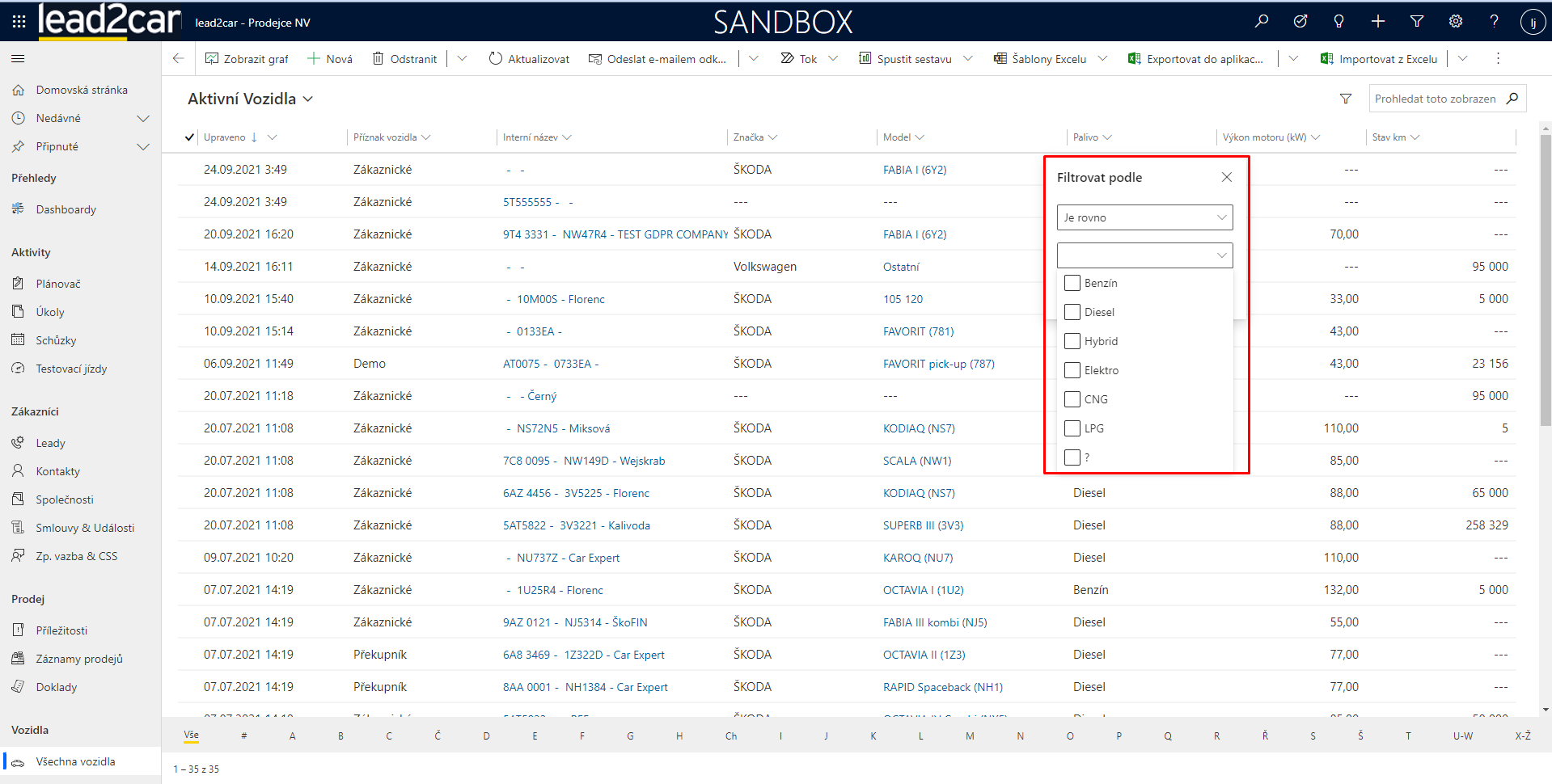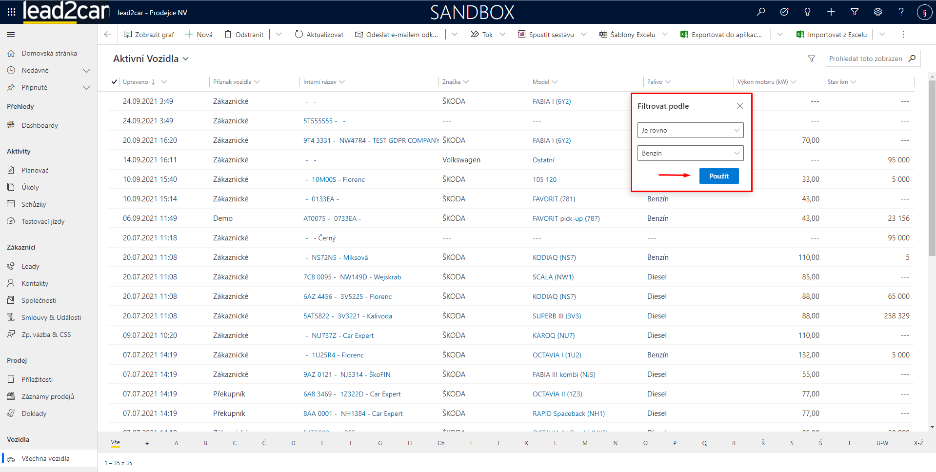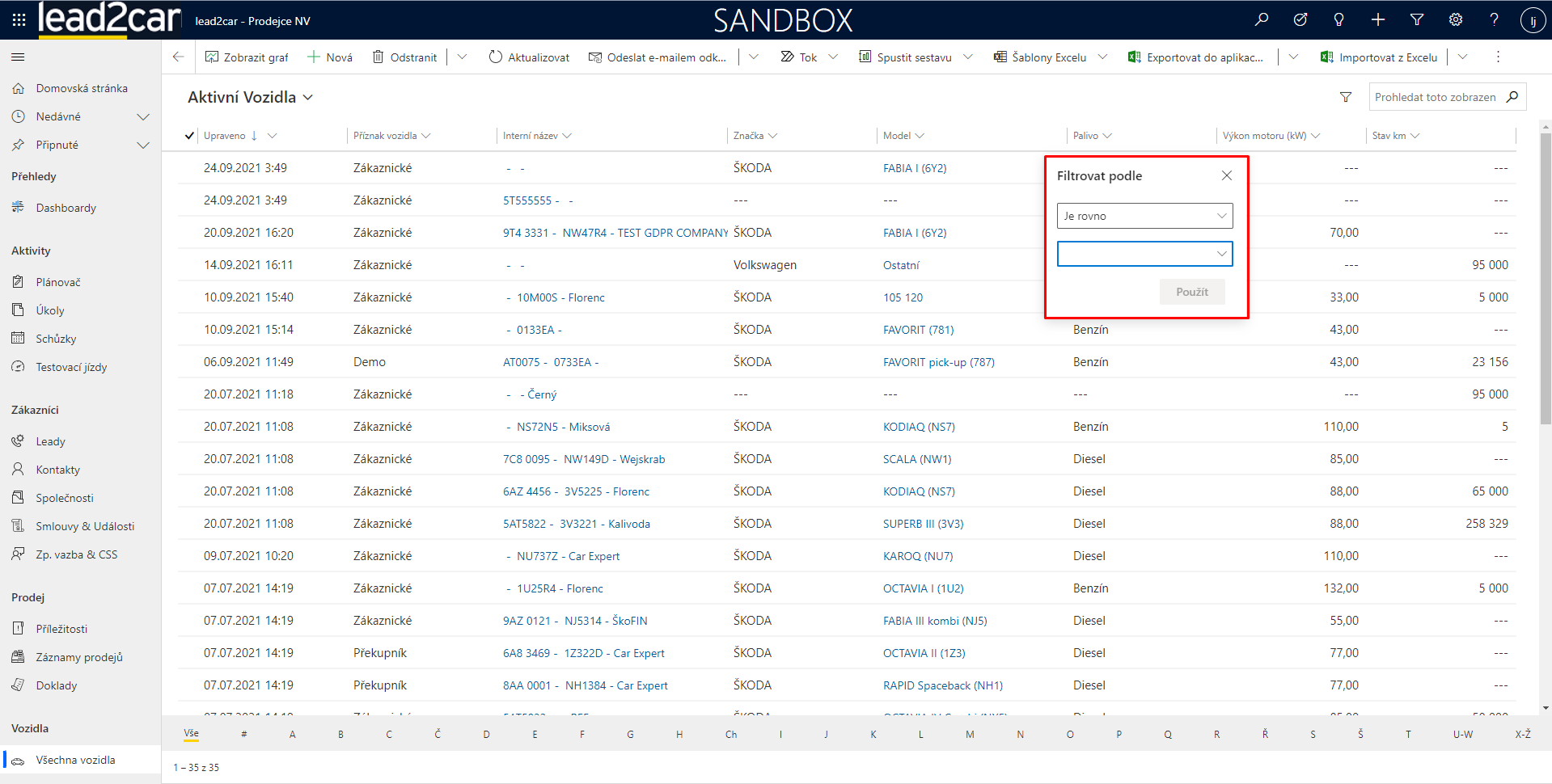 Záznamy se v lead2car dají filtrovat dvěma základními způsoby. Pokud je přímo na daném zobrazení entity pole, podle kterého chcete filtrovat, rozklikněte ikonku „šipečky dolů“ vedle názvu pole a zvolte možnost „filtrovat podle“. Poté už jen nastavíte filtr dle vašich potřeb a v zobrazení se vám ukážou odpovídající záznamy.