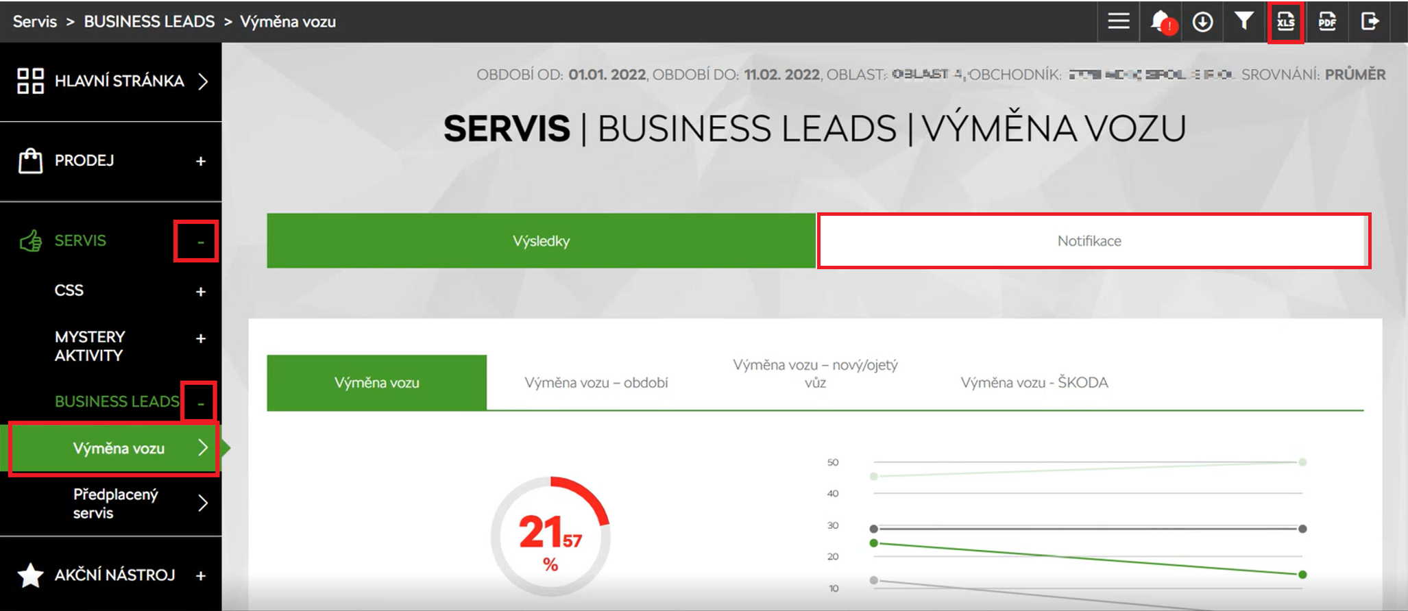 Exportovat data můžete i z Business leads. V levém menu vyberte BUSINESS LEADS, a dále Výměna vozu. Dále zvolte notifikace v horní části obrazovky. Na závěr opět pouze klikněte na ikonku XLS vpravo nahoře.