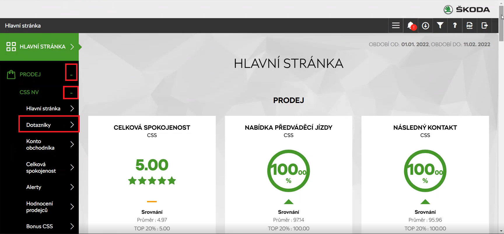 Nacházíte se na hlavní stránce ŠKODA AUTO - CSS. Nejdříve exportujte CSS nová vozidla. Takže v levém menu si rozklikněte prodej, a následně si rozklikněte CSS NV. Zde již vyberte ,,Dotazníky".