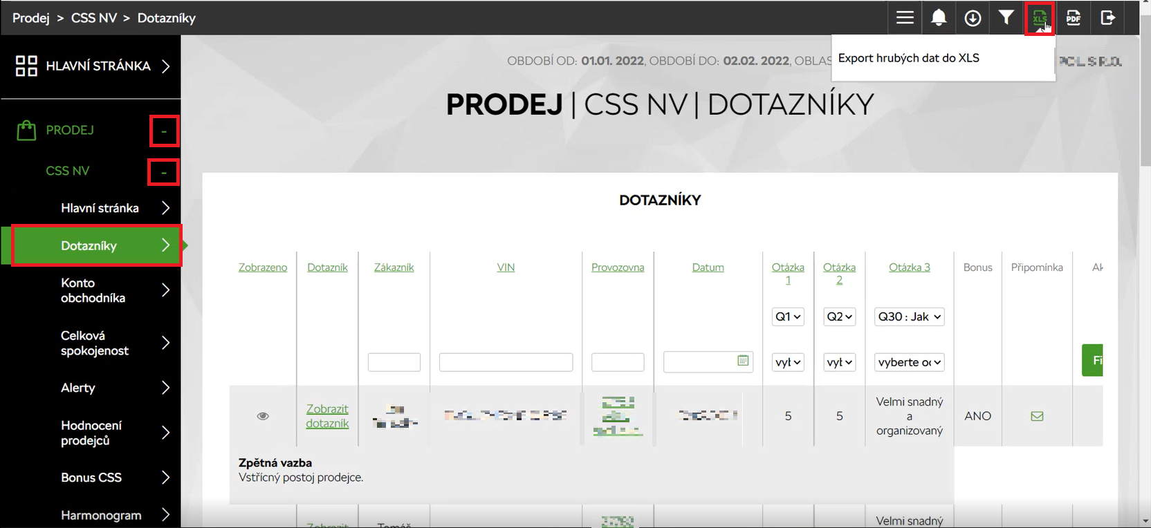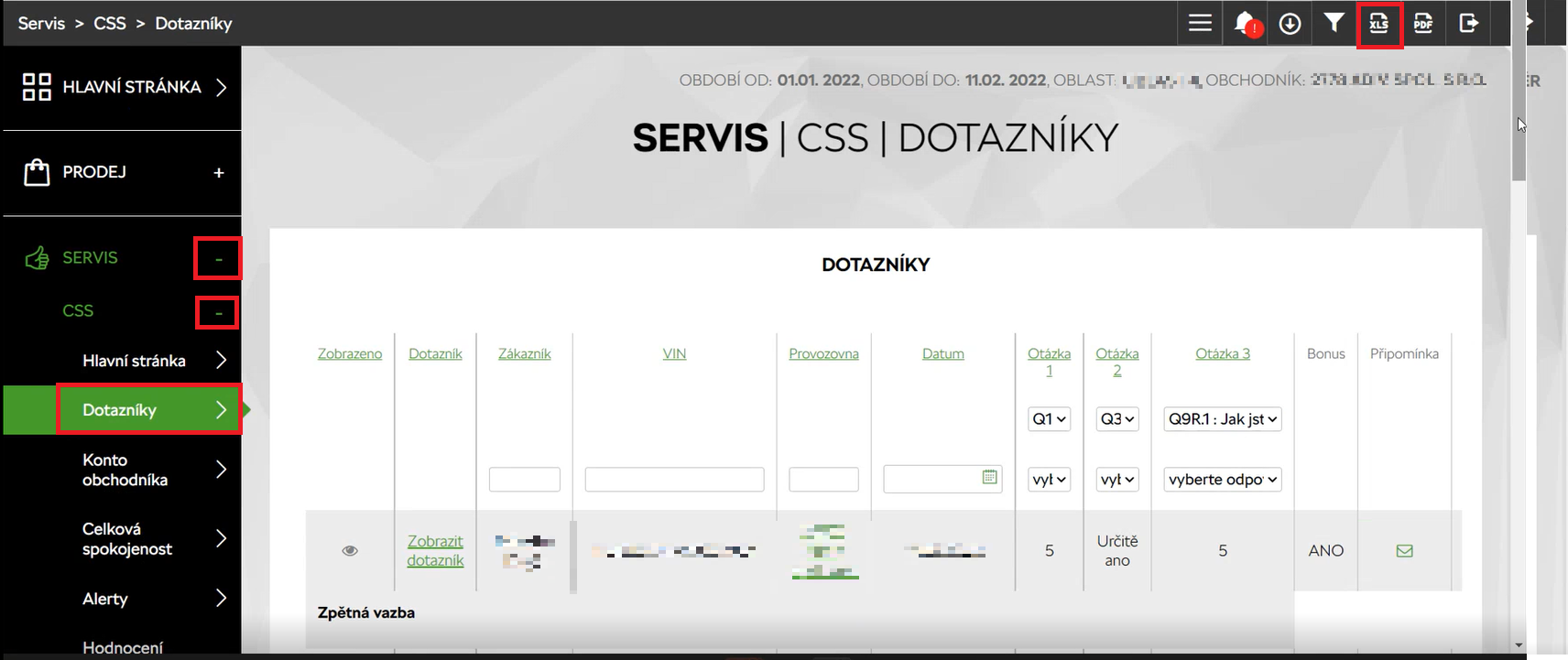Stejný proces můžete aplikovat také pro servis. Tedy v levém menu postupně rozklikněte SERVIS, CSS, a Dotazníky. Nasledně v pravém horním rohu zvoltu ikonku XLS.