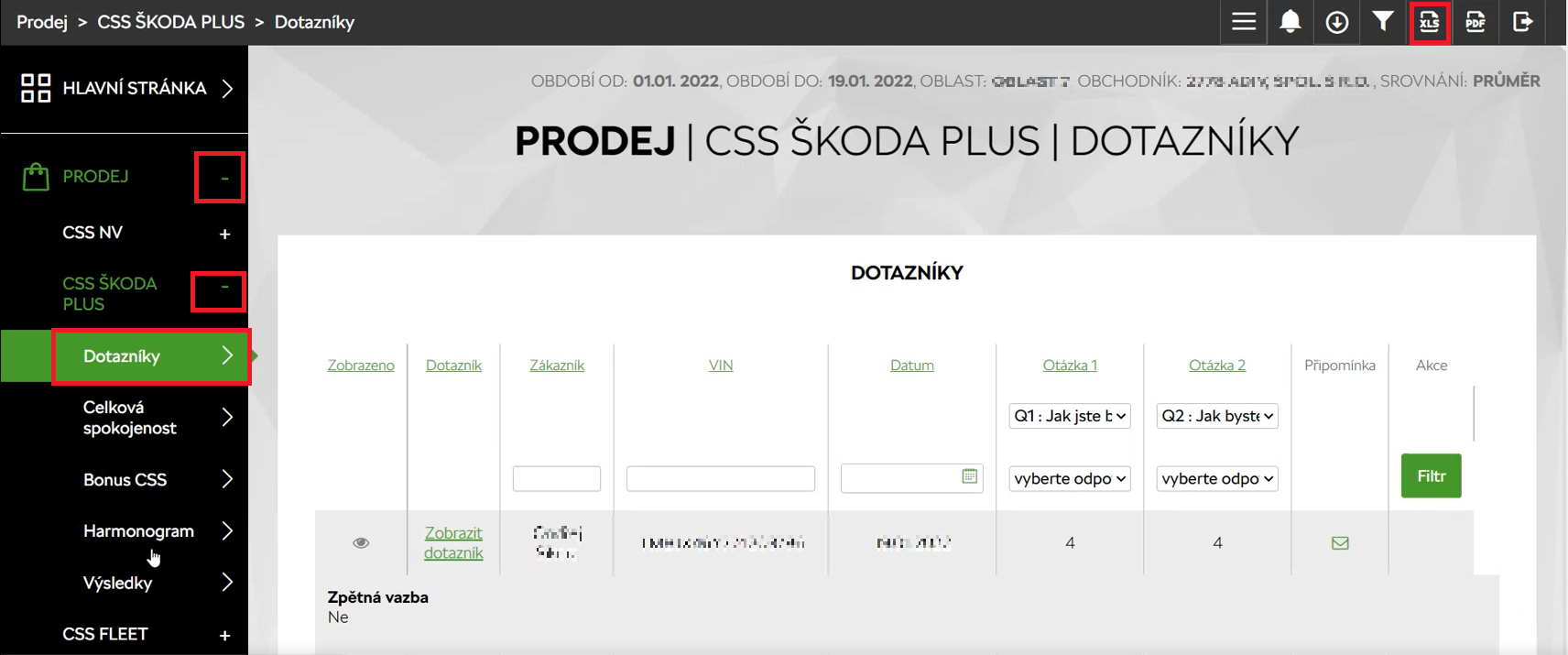 Stejný proces můžete aplikovat pro CSS ŠKODA PLUS. Tedy v levém menu postupně rozklikněte PRODEJ, CSS ŠKODA PLUS, a Dotazníky. Nasledně v pravém horním rohu zvoltu ikonku XLS.