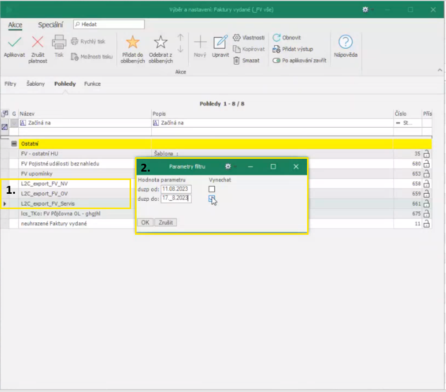 Dle potřeby vybereme L2C_export_FV_NV, L2C_export_FV_OV nebo L2C_export_FV_Servis (který obsahuje i doklady za ND) a následně zadáme data od kdy do kdy chceme doklady vygenerovat. Možnost „Vynechat“ u dat označuje, zda chceme čí nechceme zahrnout počáteční a konečné datu intervalu.