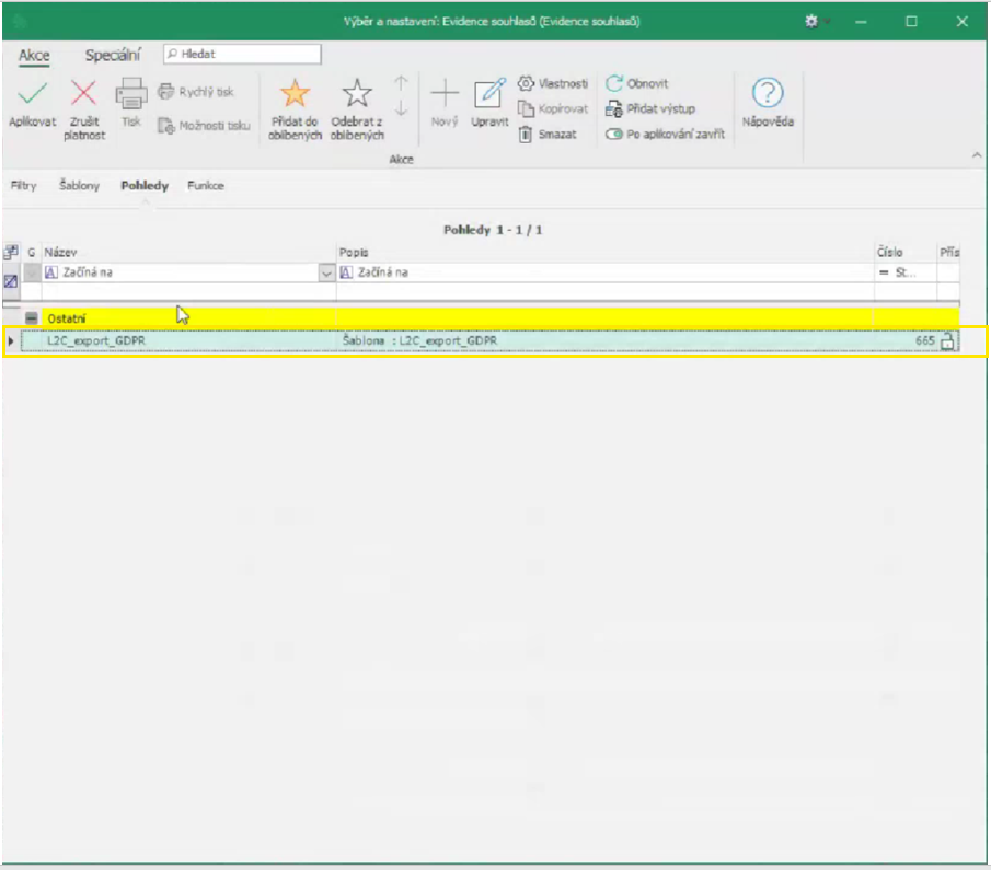 Pomocí tlačítka Pohledy v horní liště otevřeme výběr zobrazení souhlasů, kde vybereme možnost L2C_export_GDPR. Tímto se nám zobrazí všechny požadované sloupce.
