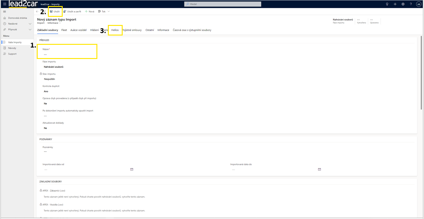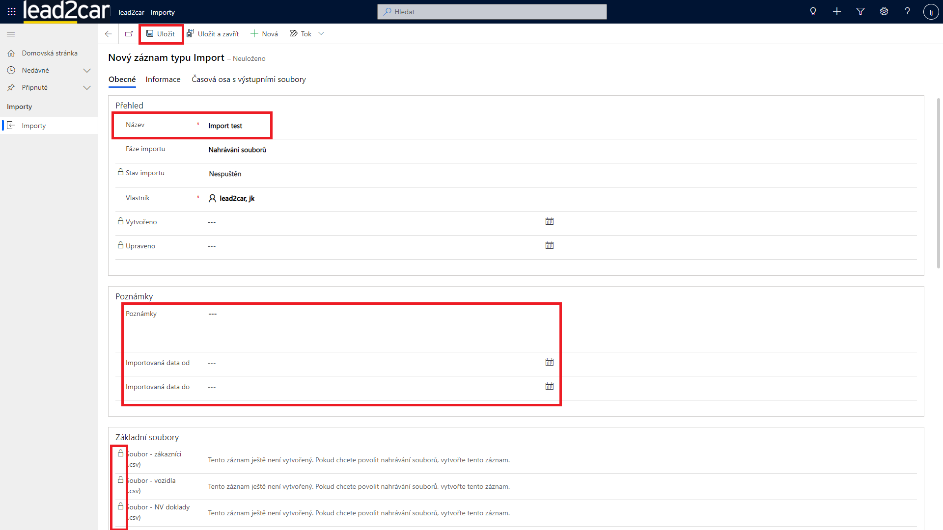 Zadejte název importu podle vaší interní konvence. Níže můžete přidat poznámku k importu, můžete zaznamenat období, pro které jsou data nahrávány. Aby se zpřístupnila pole pro nahrávání dat, musíte záznam o importu nejprve uložit (tlačítko nahoře).