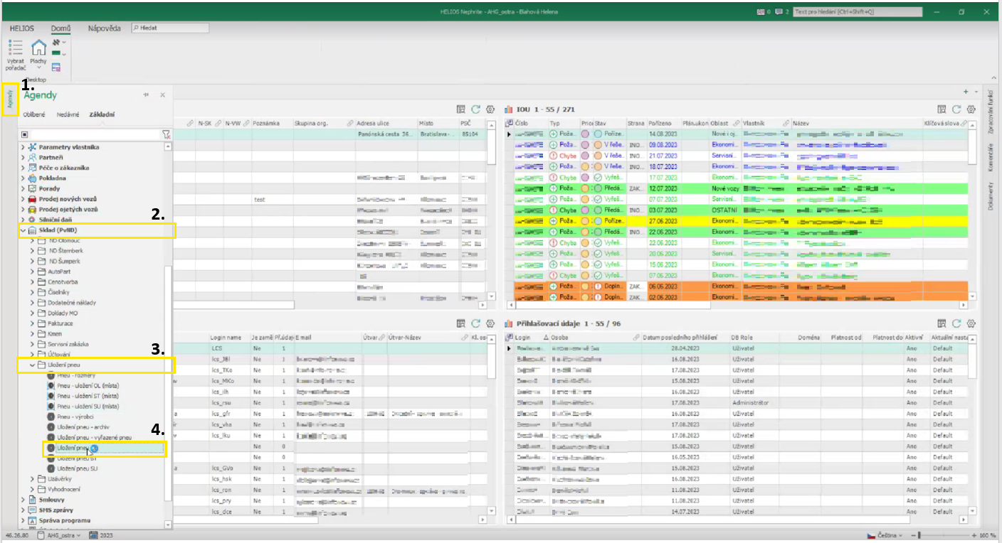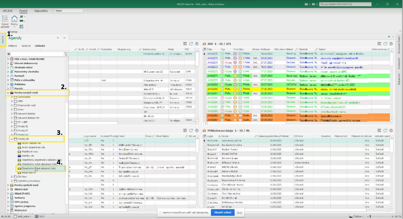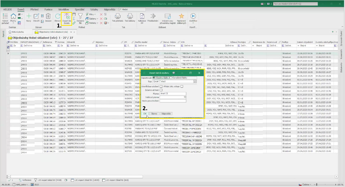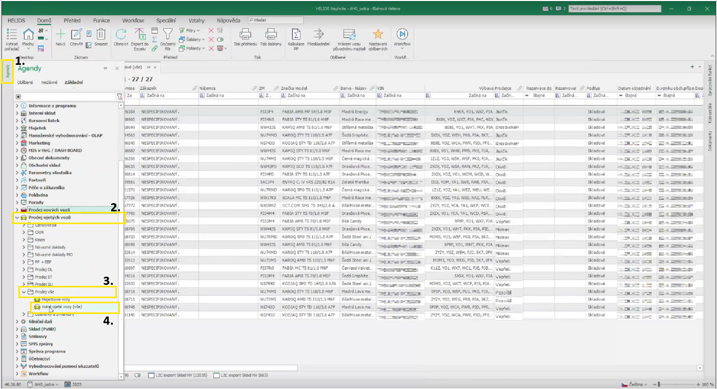 V Heliosu se pod tlačítkem Agendy vlevo skrývá menu. Po otevření menu je třeba zde najít kategorii Prodej nových vozů. Zde dále vybereme podkategorii Prodej vše. Nyní je třeba kliknout na Objednávky volné skladové (vše).