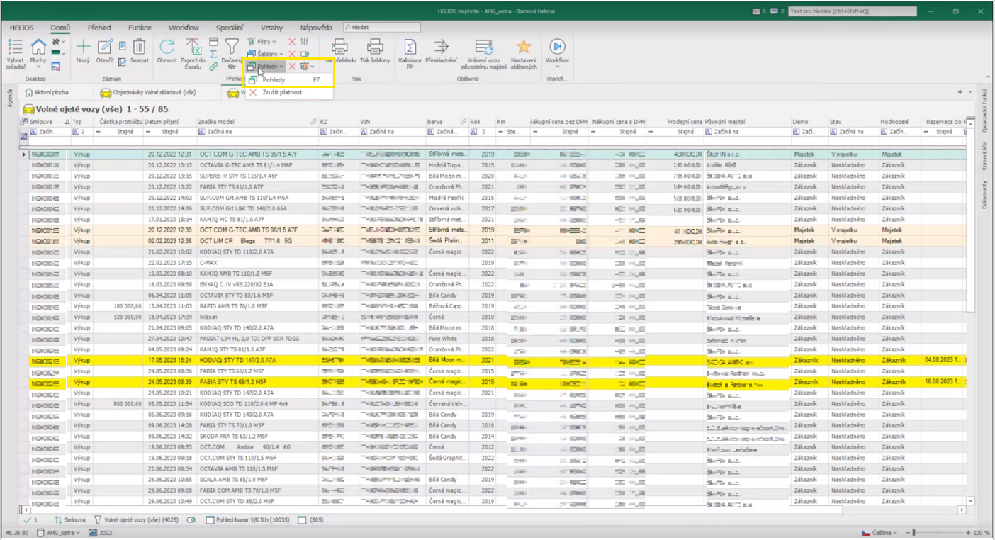 Nyní nás systém převezme na záložku Skladu nových vozů. V horní liště lze nalézt tlačítko Pohledy. Po kliknutí na něj je třeba vybrat opět možnost pohledy.