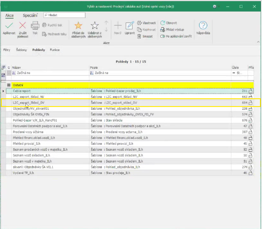 Nyní se objeví tabulka se seznamem různých pohledů. Zde je třeba vybrat L2C_export_Sklad_OV.