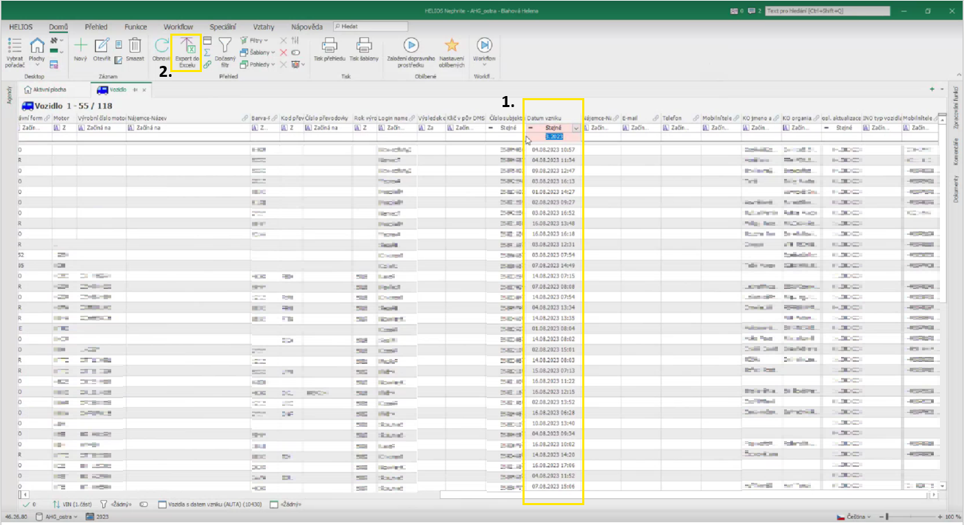 Je ale možnost i jiného filtrování, například nastavení přesných dat od – do. V takovém případě je třeba myslet na to, že místo pomlčky se zde využívají dvě tečky. Forma omezení by tedy byl například 2.8.2023..15.8.2023. Po omezení sestavy na daný interval je možné vozidla vyexportovat pomocí tlačítka v horní liště.