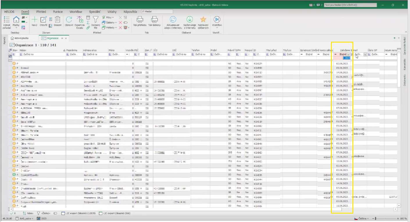 Zde je možné výběr omezit na vybrané záznamy pomocí sloupce Datum vzniku, který lze najít po posunutí doprava. Pokud bychom chtěli například vyfiltrovat zákazníky, kteří byli v systému založeni v srpnu 2023, napíšeme do filtru 8.2023.