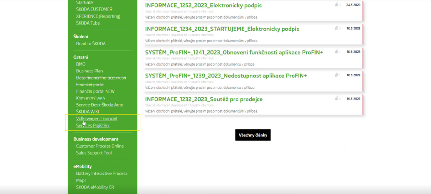Ve Škoda B2B portálu lze v levém menu nalézt aplikaci Volkswagen Financial Services Pojištění (do této aplikace je třeba nejdříve zažádat o přístup).