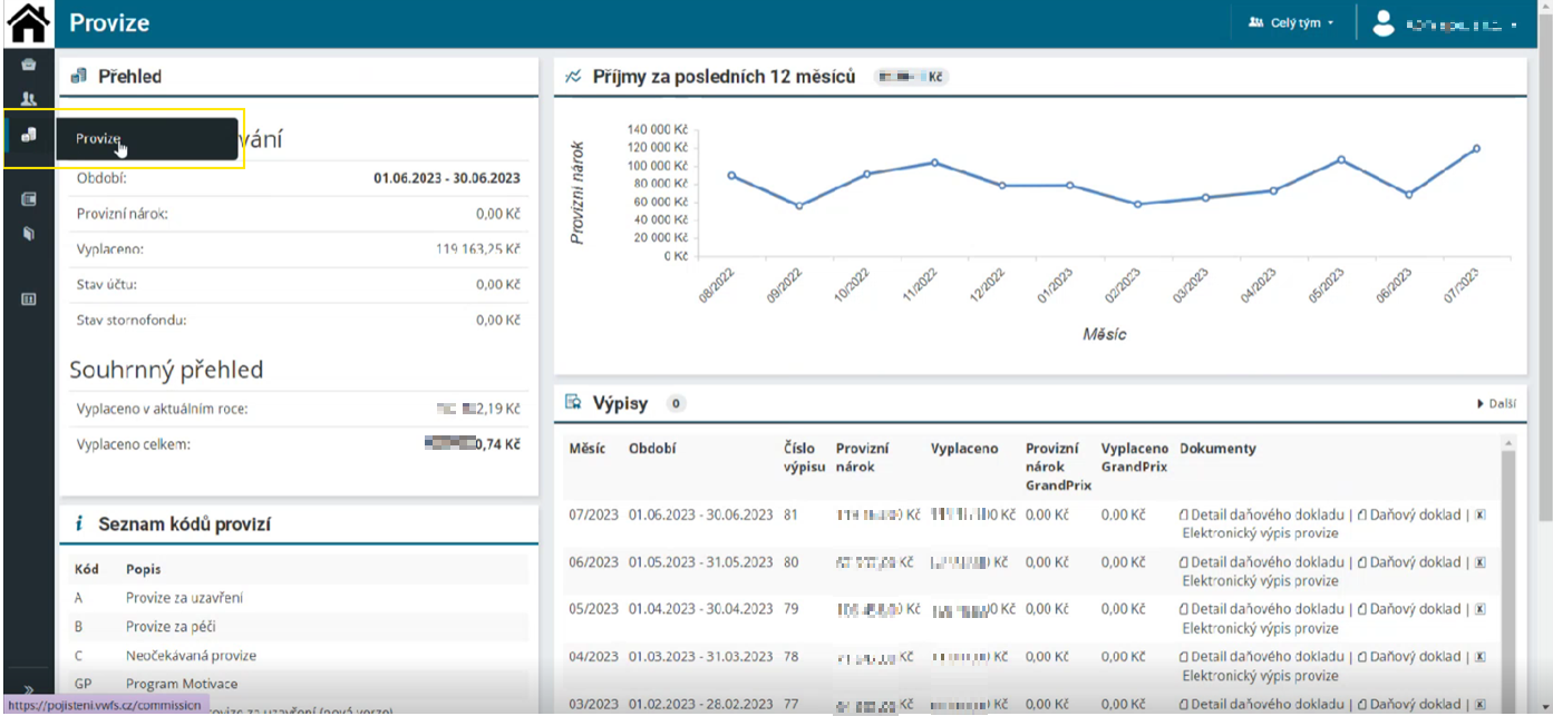 Po kliknutí bude otevřena přihlašovací stránka, kde je třeba vyplnit údaje a projít ověřením. Po přihlášení se otevře aplikace, kde je třeba vlevo vybrat ikonu mincí a zvolit „Provize“.