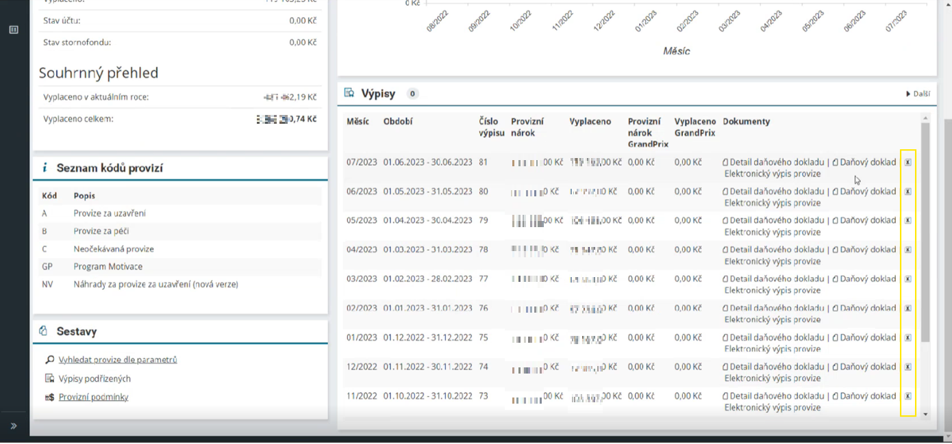 Nyní stačí sjet dolů na stránce, kde jsou v pravé dolní části umístěné výpisy. Zde lze pomocí „x“ vpravo v řádku stáhnout výpis za daný měsíc.