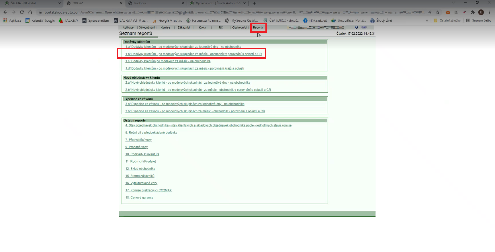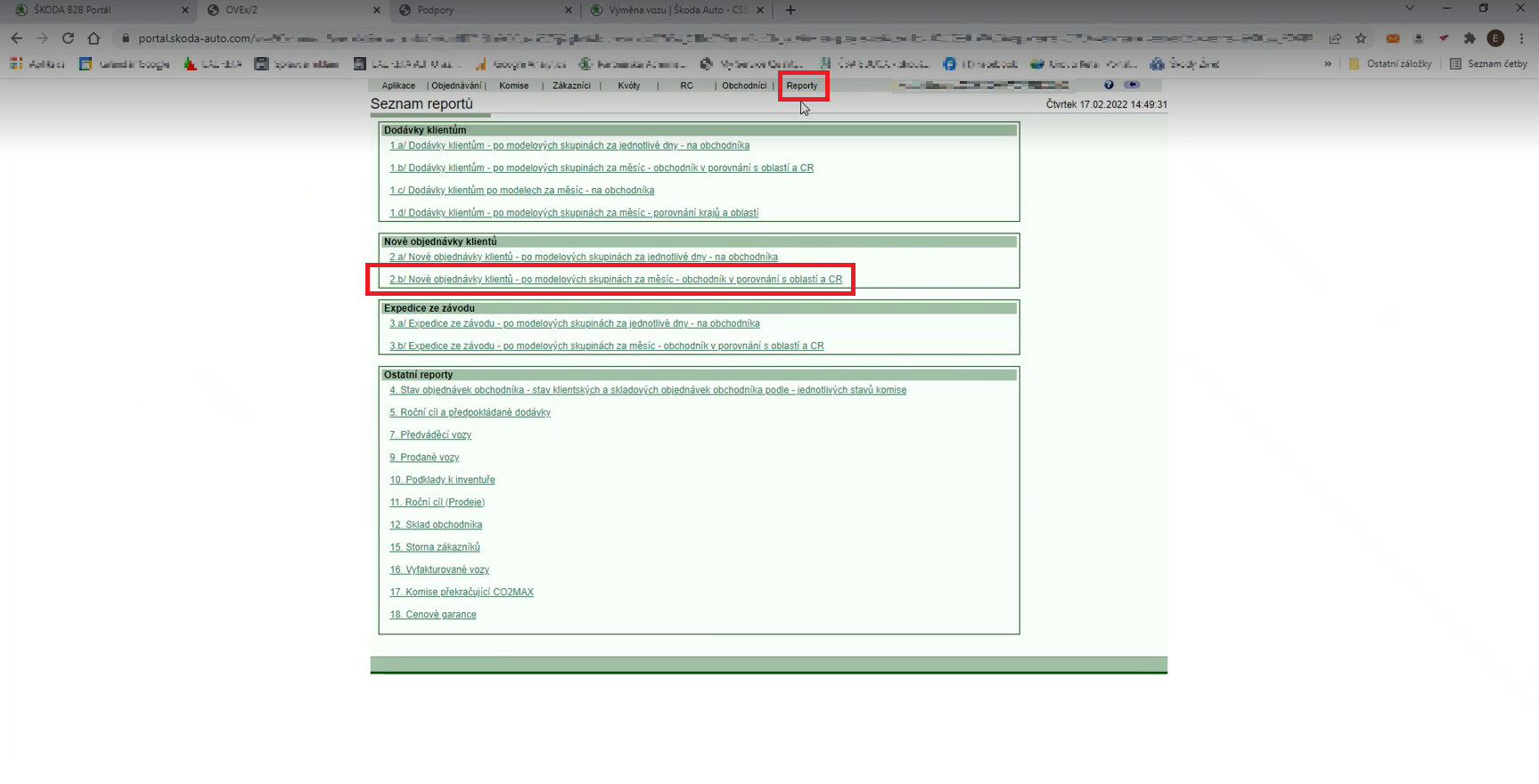 V OVEXu – klikneme na záložku Reporty a zvolíme pole 2b/ Nové objednávky klientů.