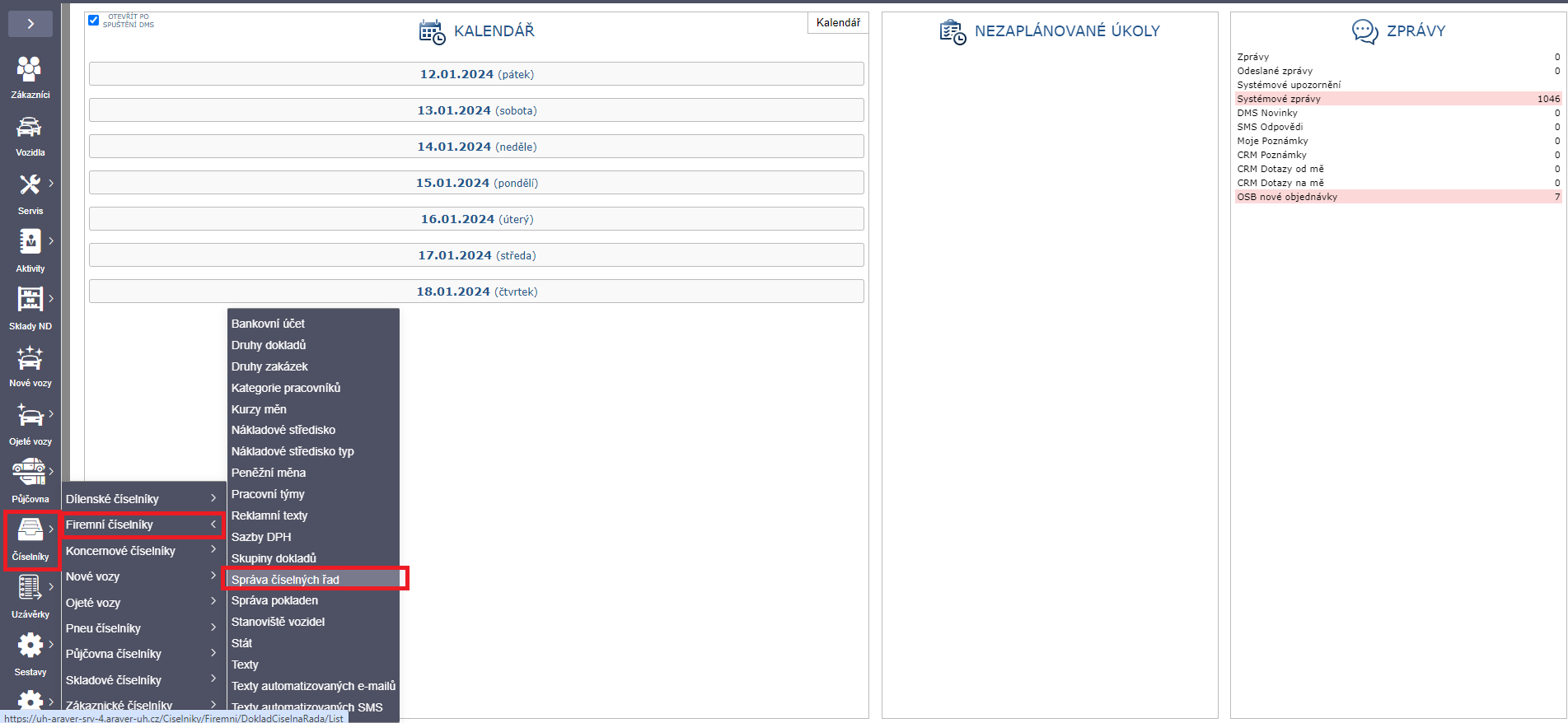Pro určení dokladů a přiřazení ke správné pobočce je potřeba z DMS 3 stáhnout: "Číselníky" - "Firemní číselníky" - "správa číselných řad"