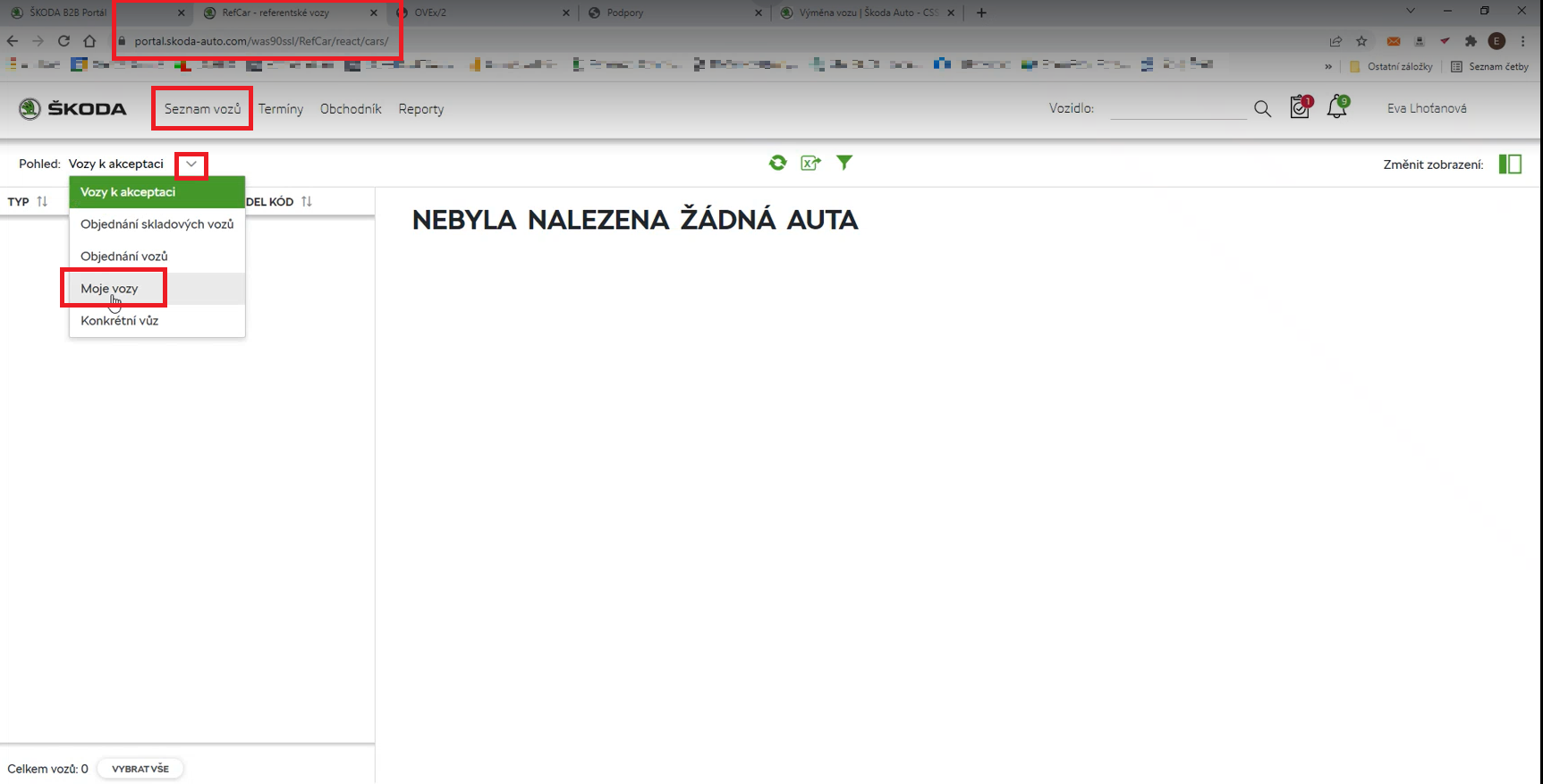 V B2B portálu zvolíme RefCar (ŠKODA Plus) a následně klikneme na pole Seznam vozů. Poté na šipku dolů a vybereme Moje vozy.