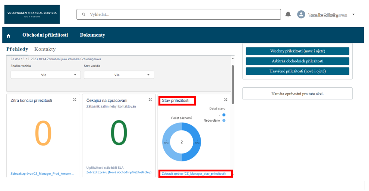 Zde přejděte do Přehledy – Dashboardy. Dále zvolte u grafu Stav příležitostí možnost Zobrazit zprávu (CZ_Manager_stav_prilezitosti).