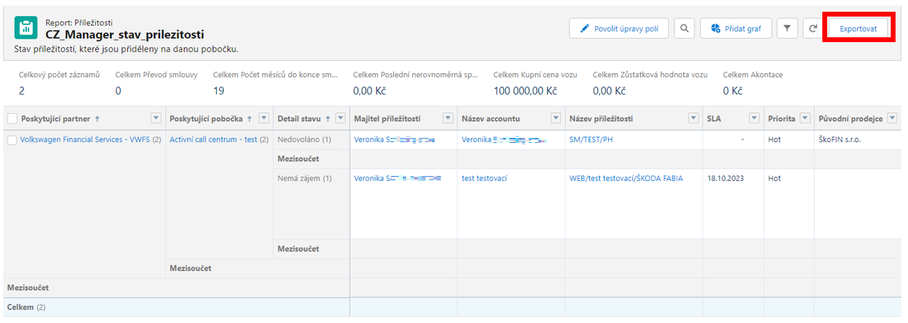 Bude otevřen report. Nyní je třeba zvolit možnost Exportovat v pravém horním rohu.