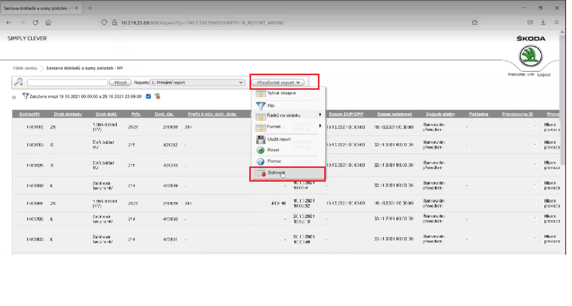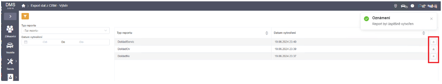 Report následně stáhneme kliknutím na ikonu šipky na pravé straně vybraného reportu.