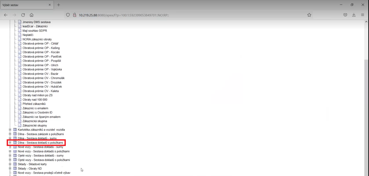 Zde Klikněte na „Dílna – Sestava dokladů s položkami“. Zobrazí se vám záznamy.