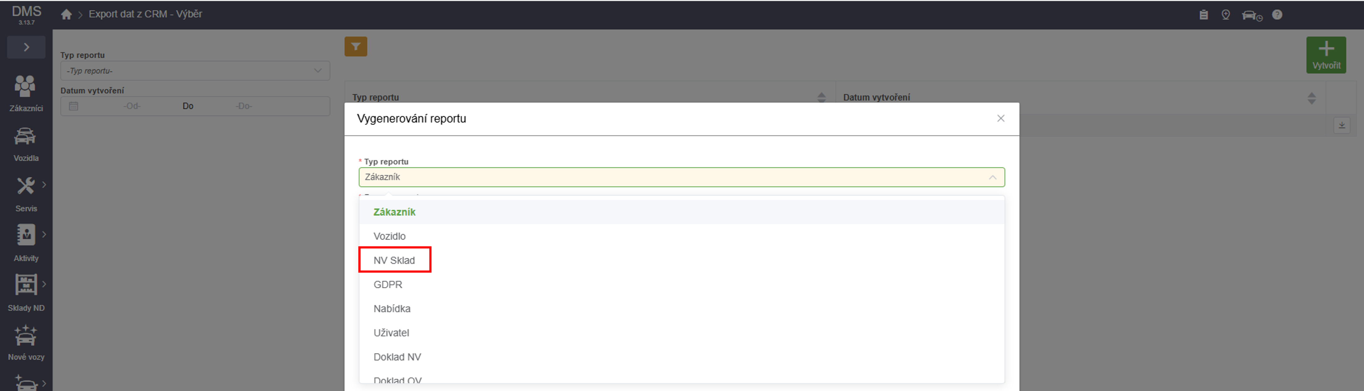 V Menu DMS3 vyberte "Ojeté vozy" a posléze "Sklad"