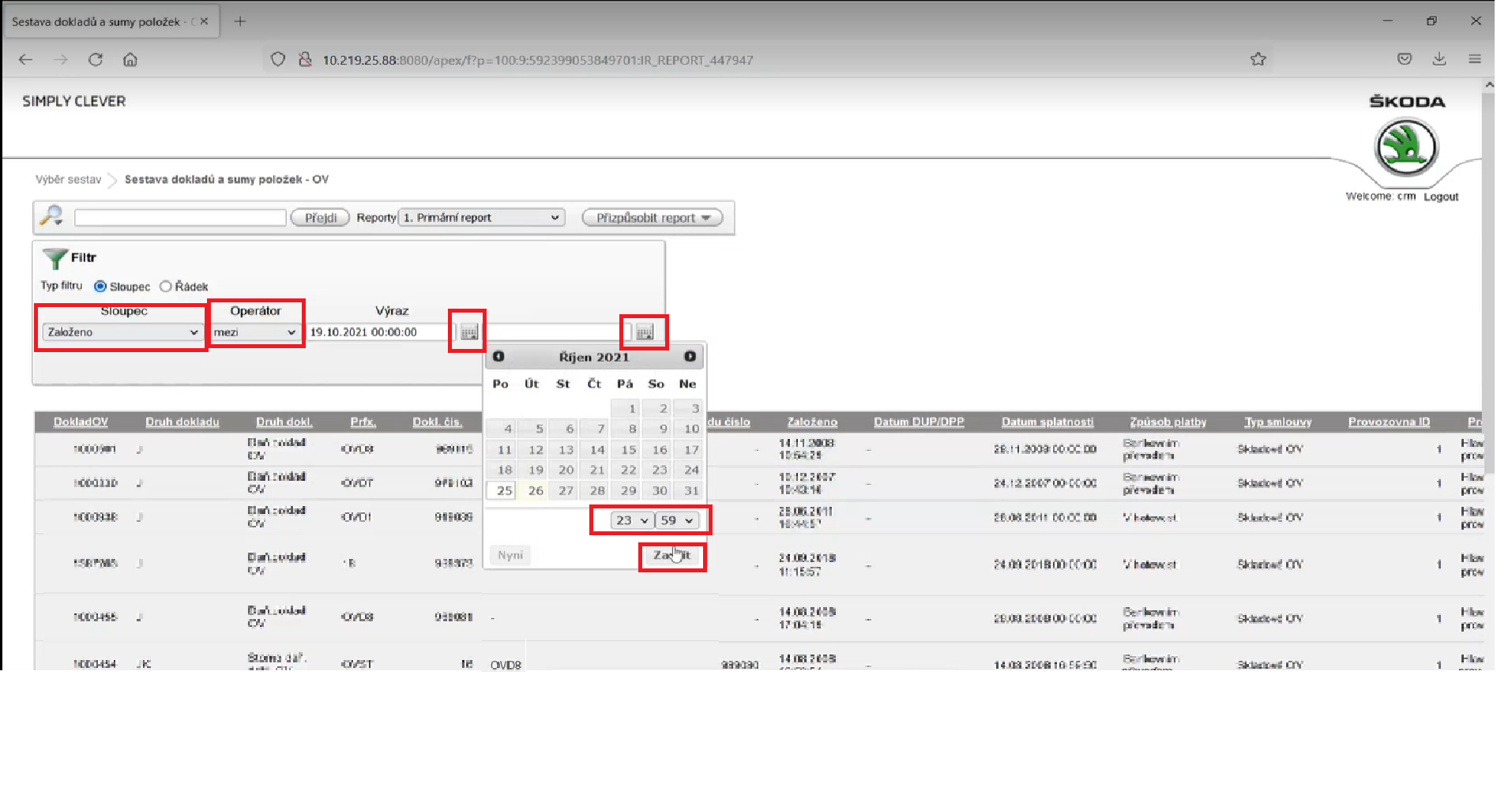 Důležitý je sloupec „Založeno“ – ten vyberte v položce „Sloupec“. Směňte operátor na „mezi“. Potom vyberte datumy v položce „Výraz“. Kliknutím na ikonku kalendáře vyberte datum z nabídnutého kalendáře. Změňte čas od 0:00 po 23:59, abyste filtrovali údaje za celý den. Datum potvrďte kliknutím na možnost „zavřít“. Omezení je nastaveno na 10 000 řádků, proto je potřeba použít filtr a ve sloupci musí být „Založeno“.