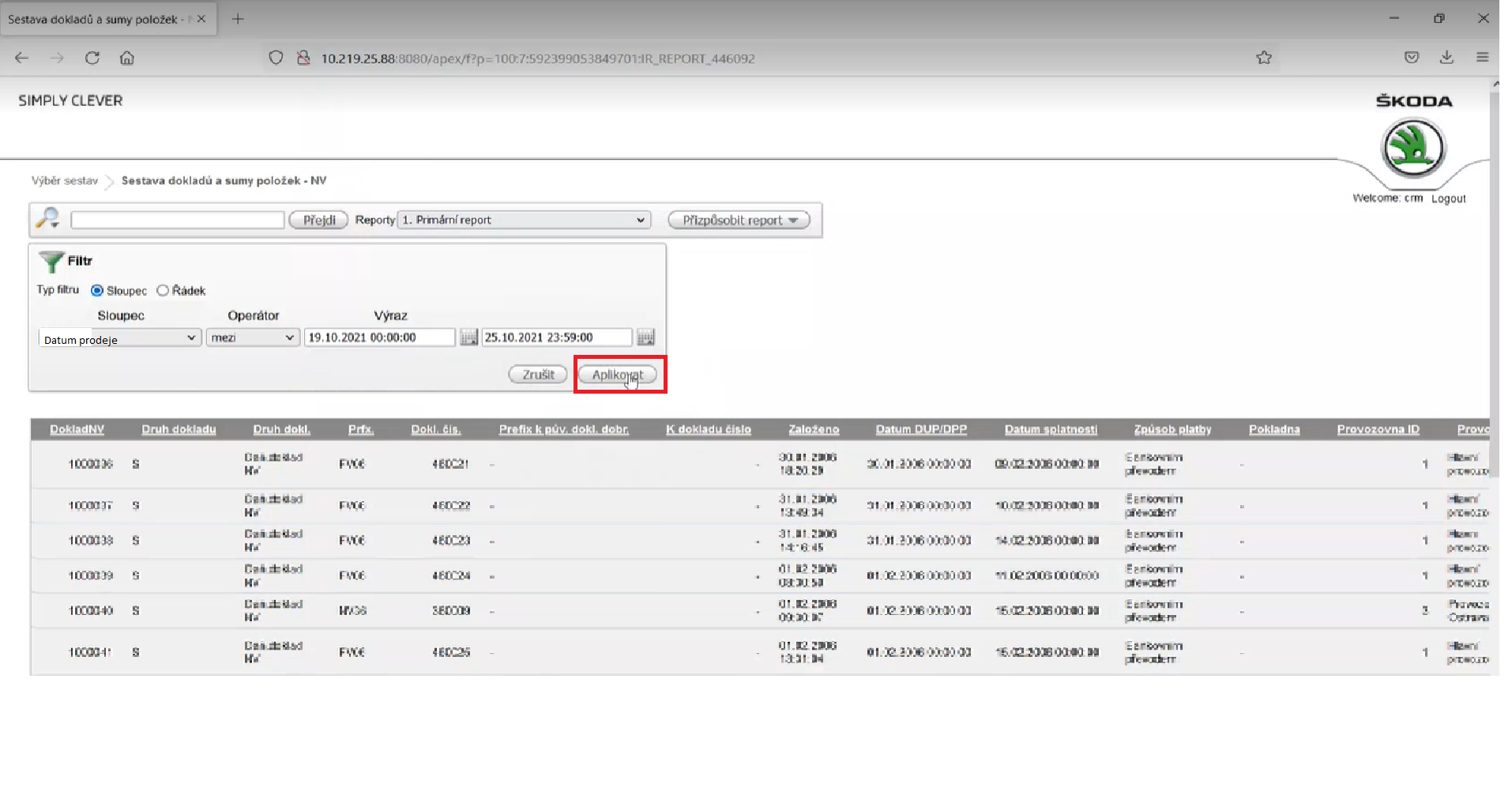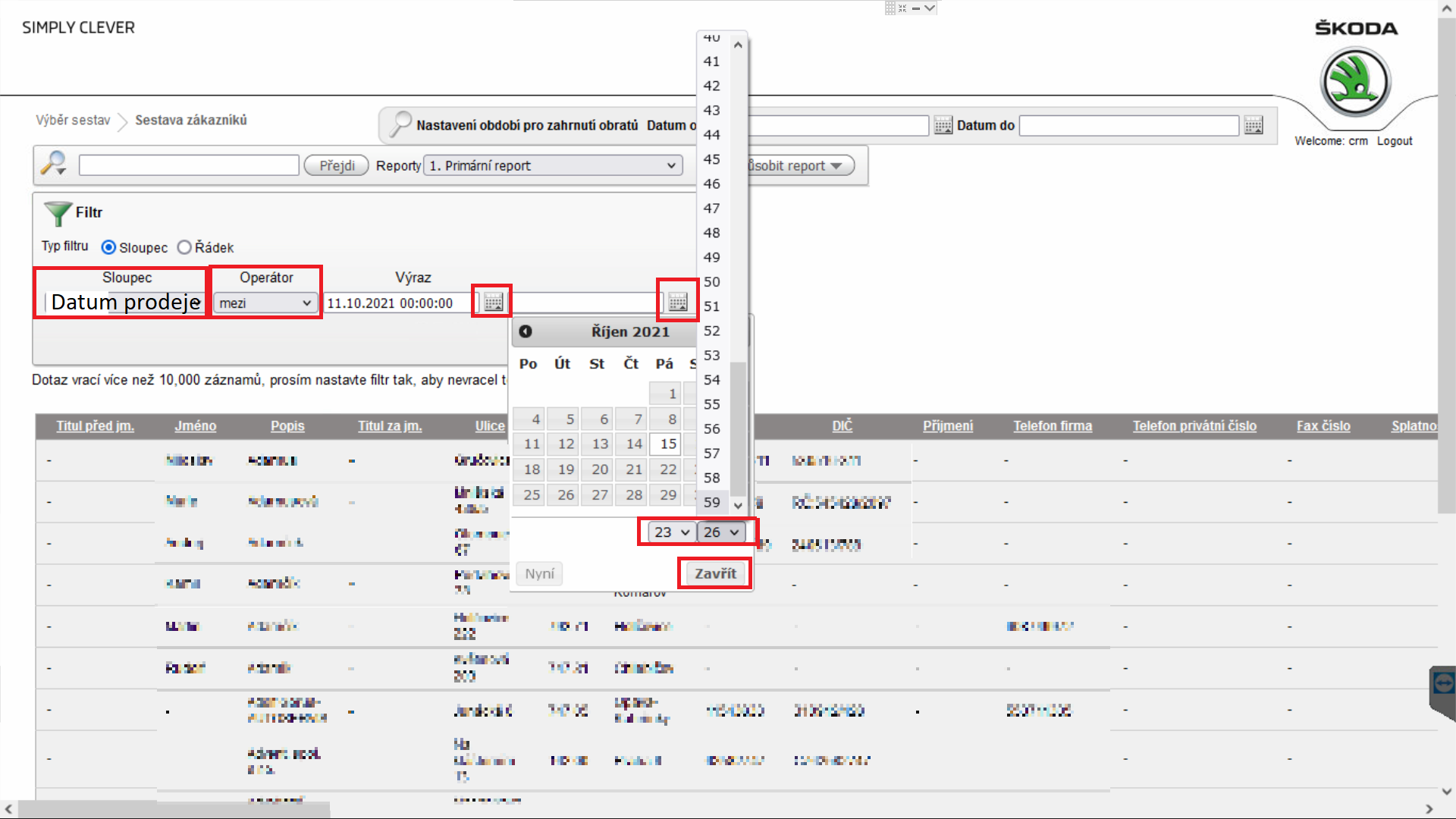 Důležitý je sloupec „Datum prodeje“ – ten vyberte v položce „Sloupec“. Směňte operátor na „mezi“. Potom vyberte datumy v položce „Výraz“. Kliknutím na ikonku kalendáře vyberte datum z nabídnutého kalendáře. Změňte čas od 0:00 po 23:59, abyste filtrovali údaje za celý den. Datum potvrďte kliknutím na možnost „zavřít“. Omezení je nastaveno na 10 000 řádků, proto je potřeba použít filtr a ve sloupci musí být „Datum prodeje“.