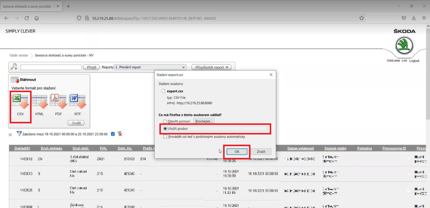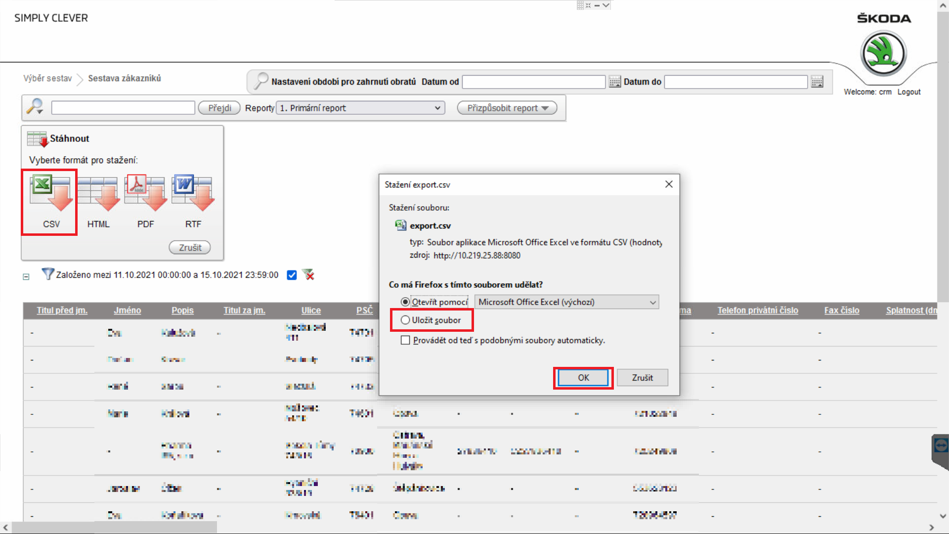 Zde musíte vybrat CSV z možností nalevo. Poté vám vyskočí okno, kde zvolte možnost ,,uložit soubor“ a stiskněte ok. A soubor máte uložený. Doporučujeme před importem stažený soubor neotvírat, mohlo by dojít k jeho poškození.