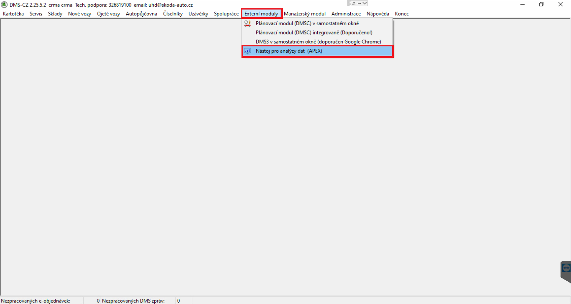 V DMS zvolte kartu „Externí moduly“ a v ní „Nástroj pro analýzy dat (APEX)“.