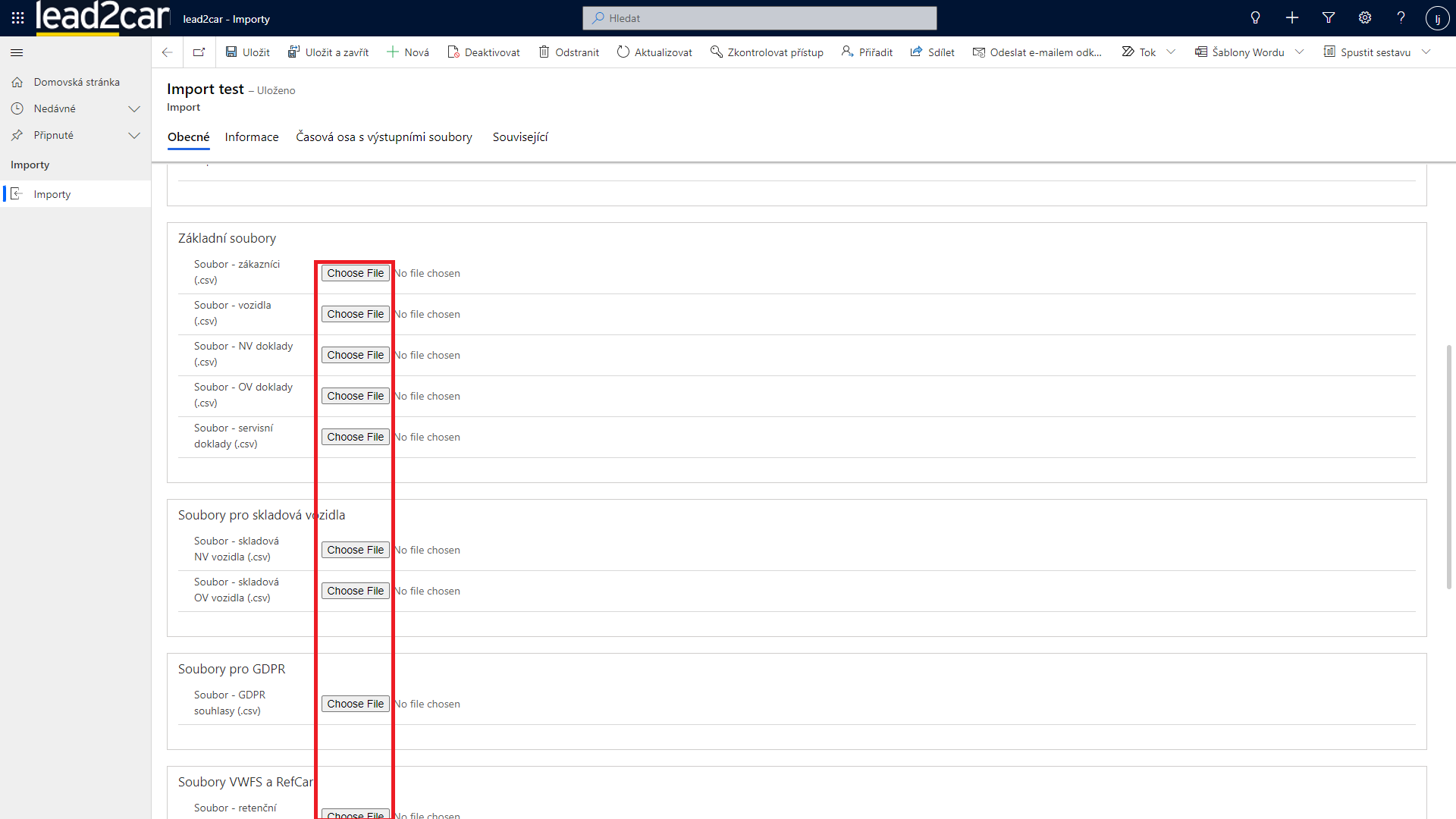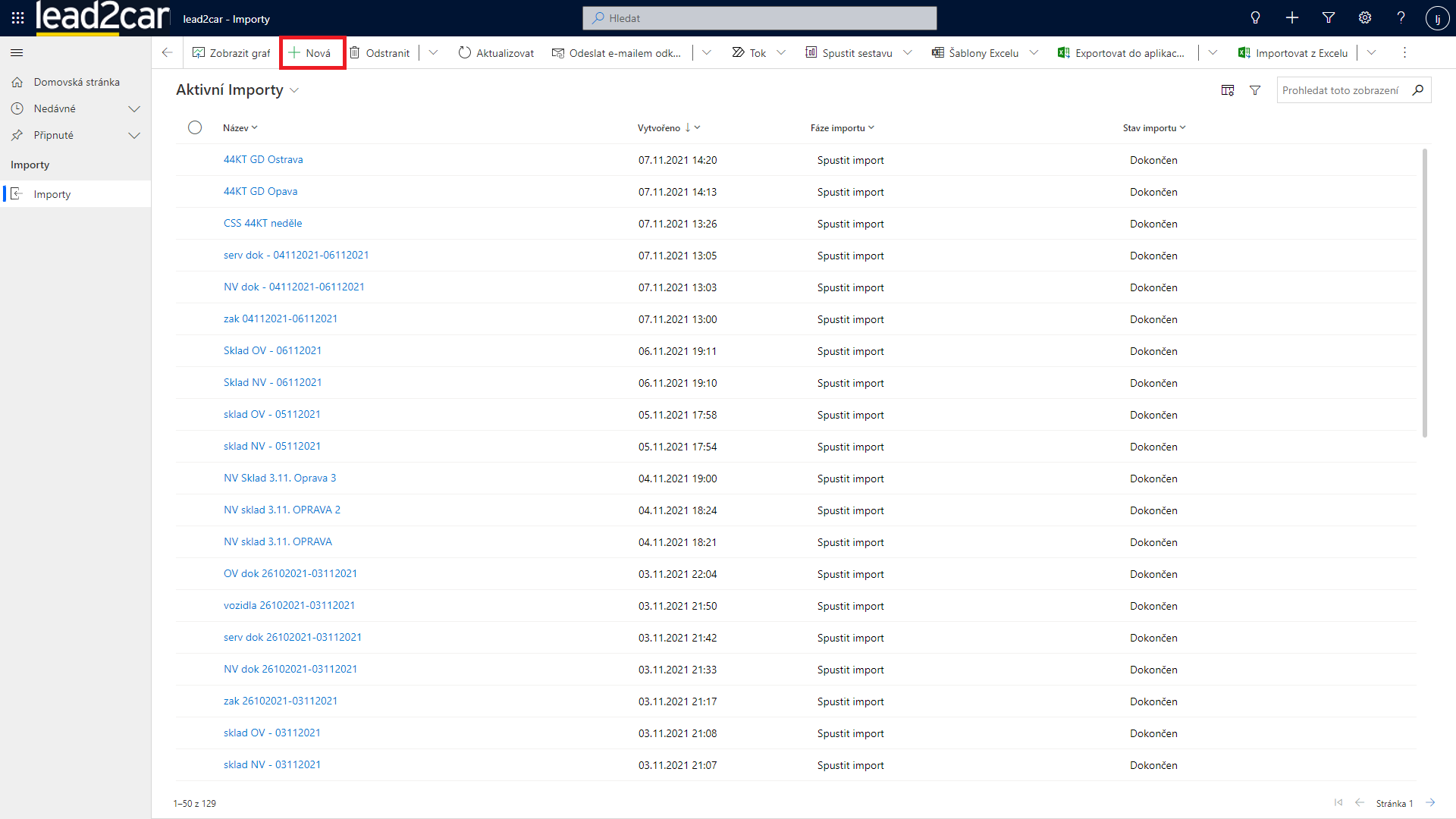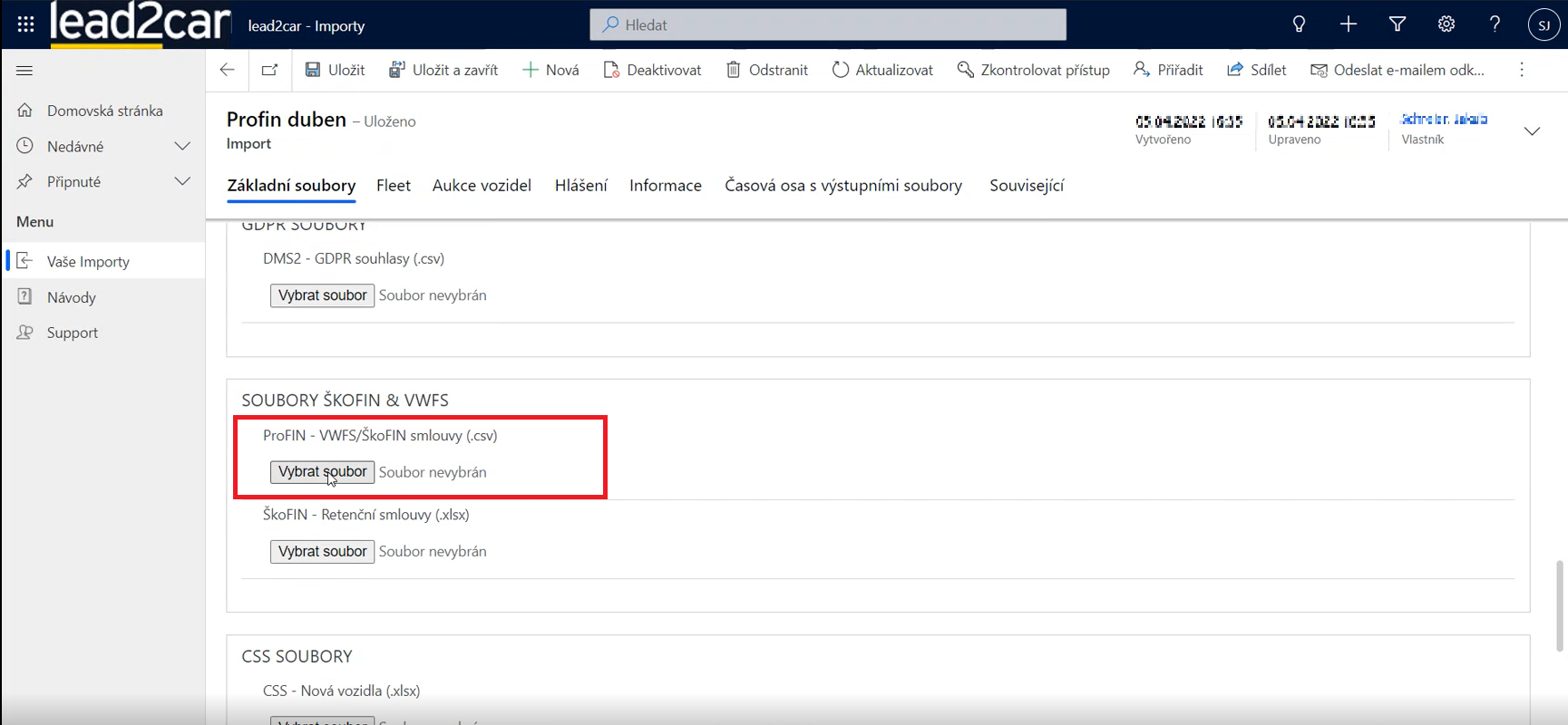 Stažená data z Profinu je nutné nahrát je do Lead2car. To se dá udělat přímo v rozhraní L2C v aplikaci "led2car - importy".