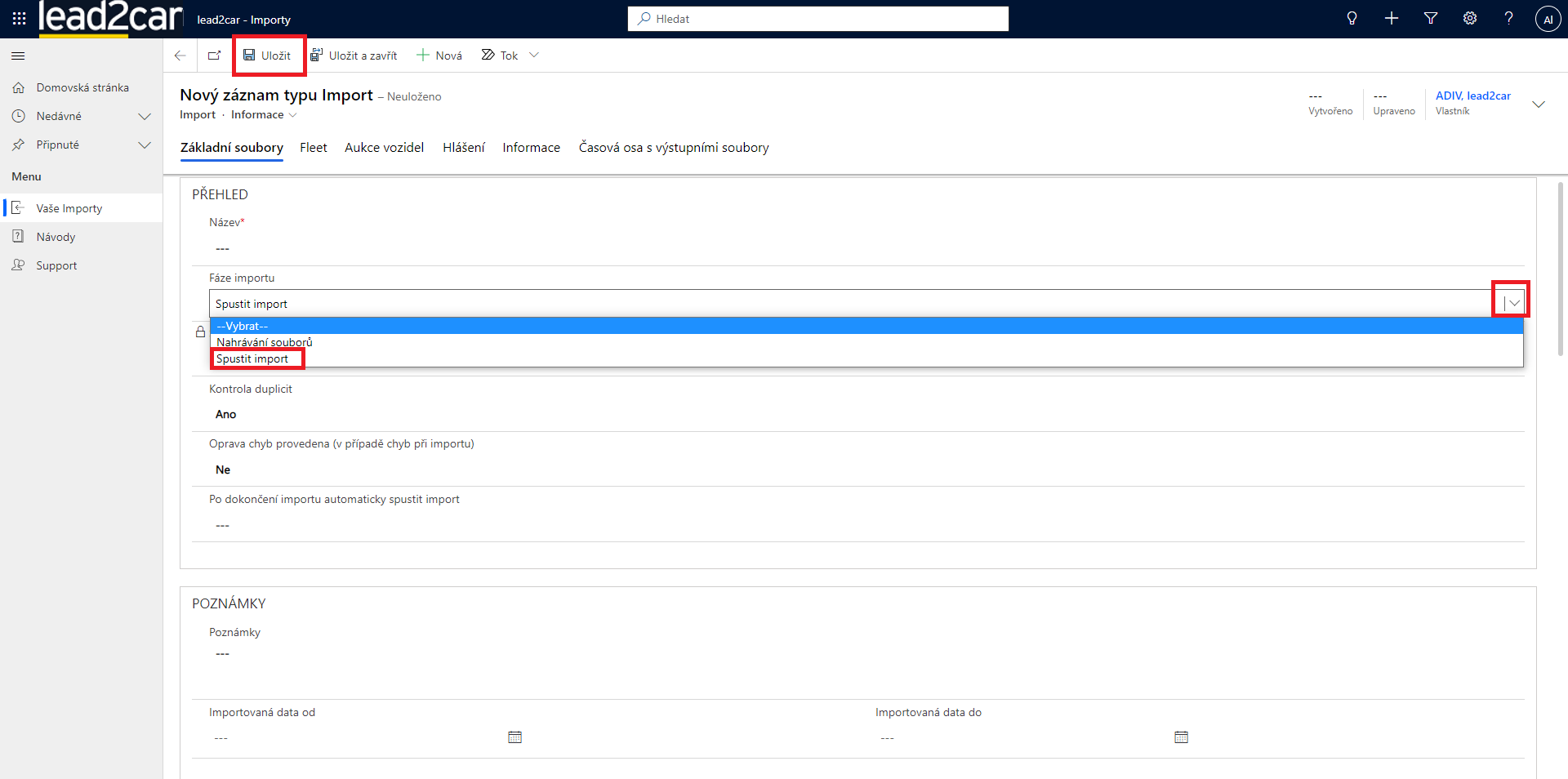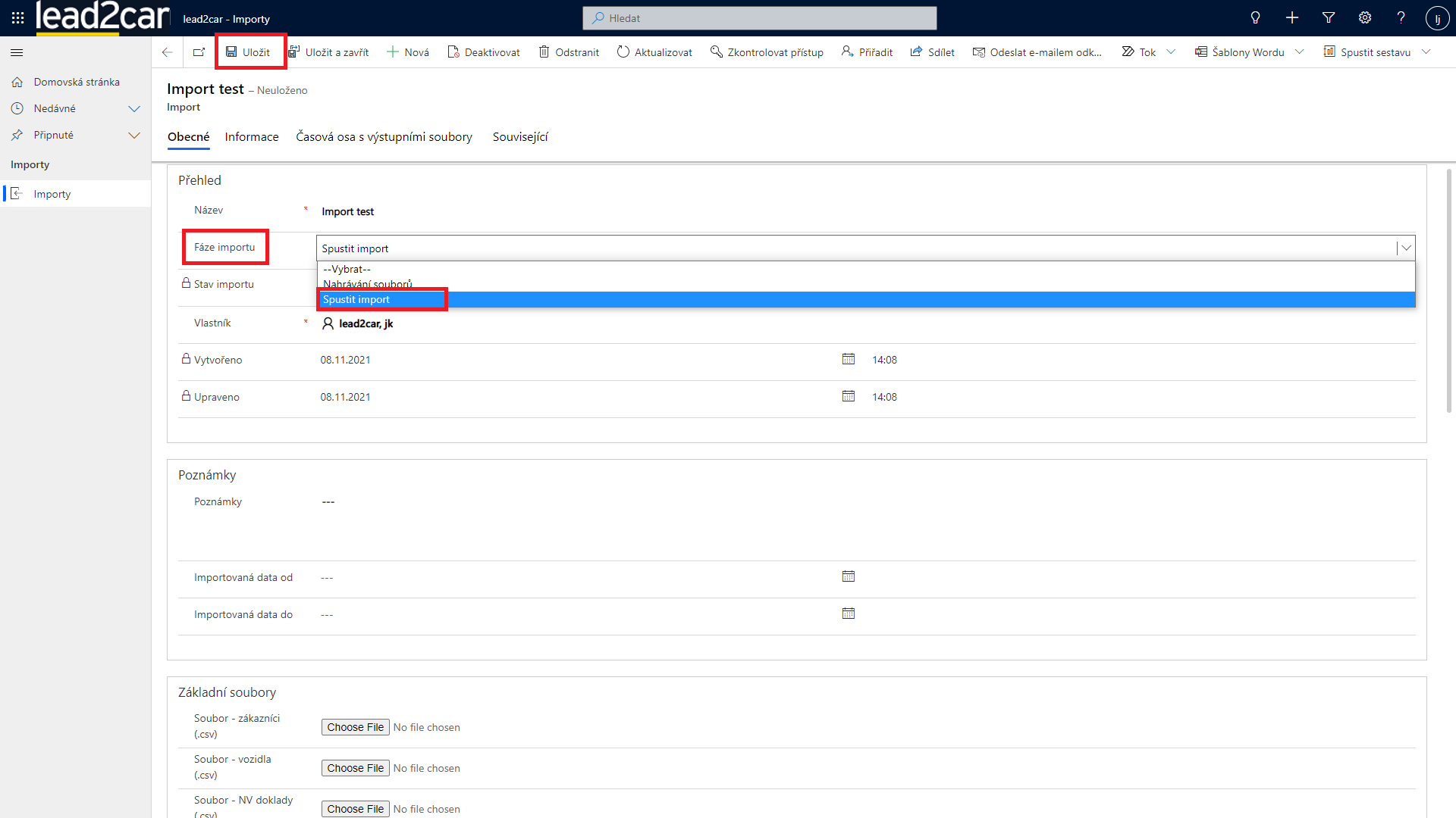 Názvem je zde myšlen název marketingového seznamu, který již musí být v momentě importu vytvořen ve vašem Lead2Car. Import tedy vždy provádějte až po vytvoření marketingového seznamu. Po výběru souboru je třeba se vrátit na záložku Základní soubory a v poli Fáze importu vybrat Spustit import. Nyní stačí záznam uložit opět tlačítkem v horní liště a následně již budou členové marketingového seznamu do vybraného marketingového seznamu importováni.