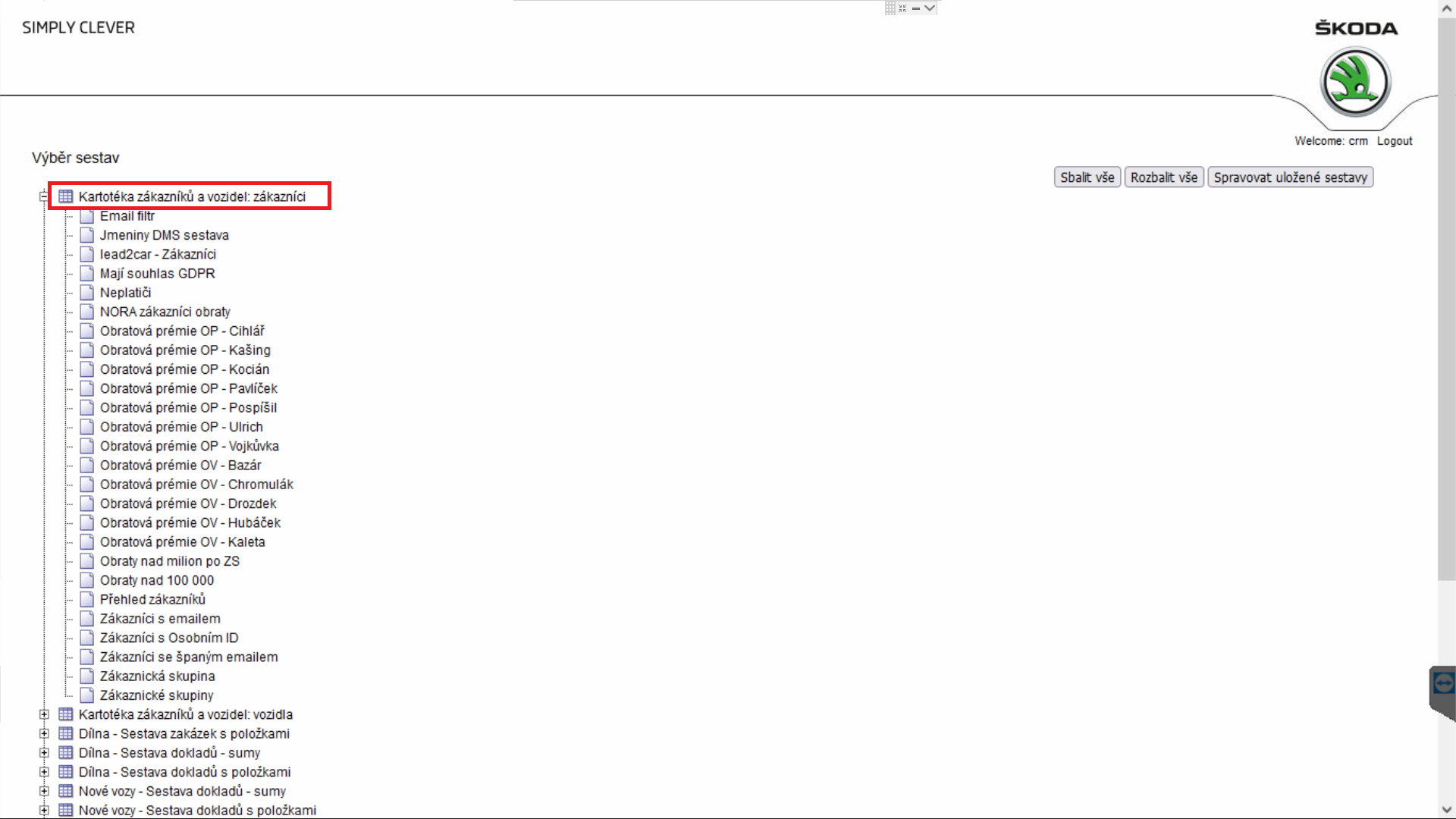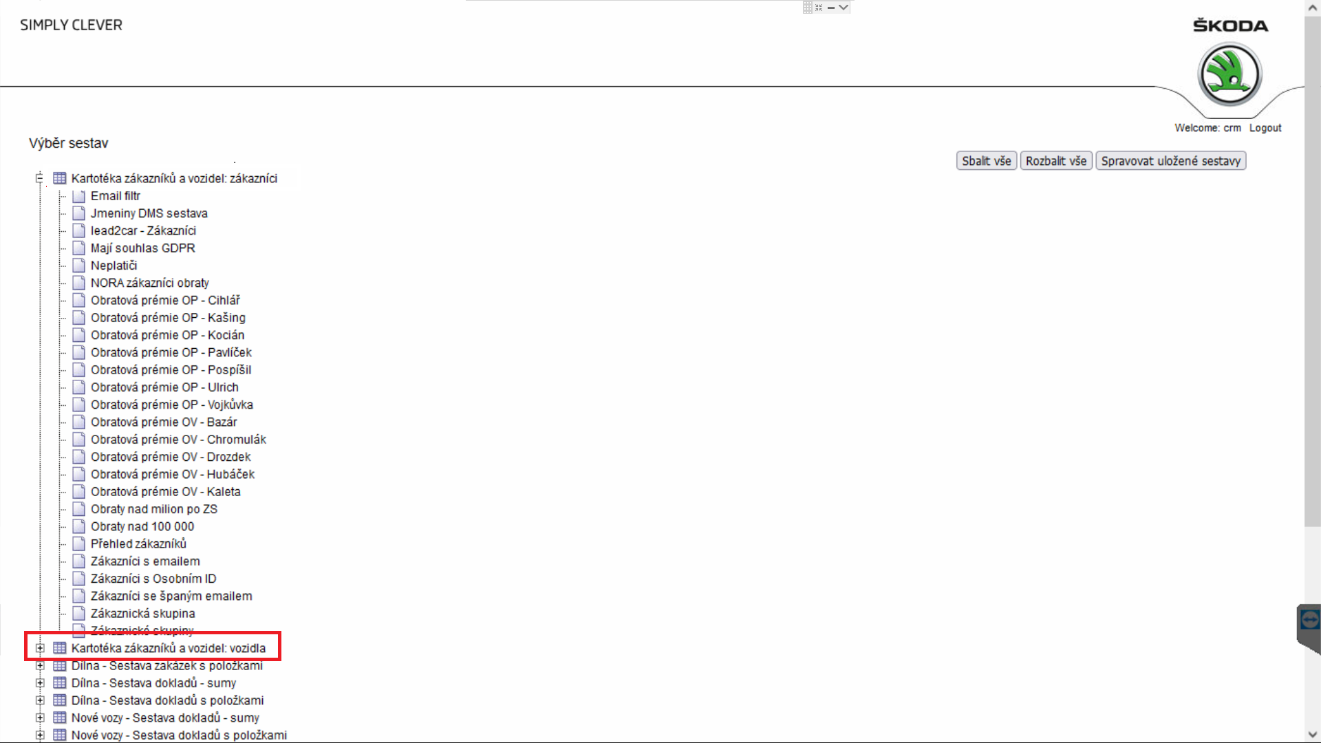 Klikněte na „Výběr sestav“, které se nachází vlevo nahoře. Zobrazí se vám sestavy.
