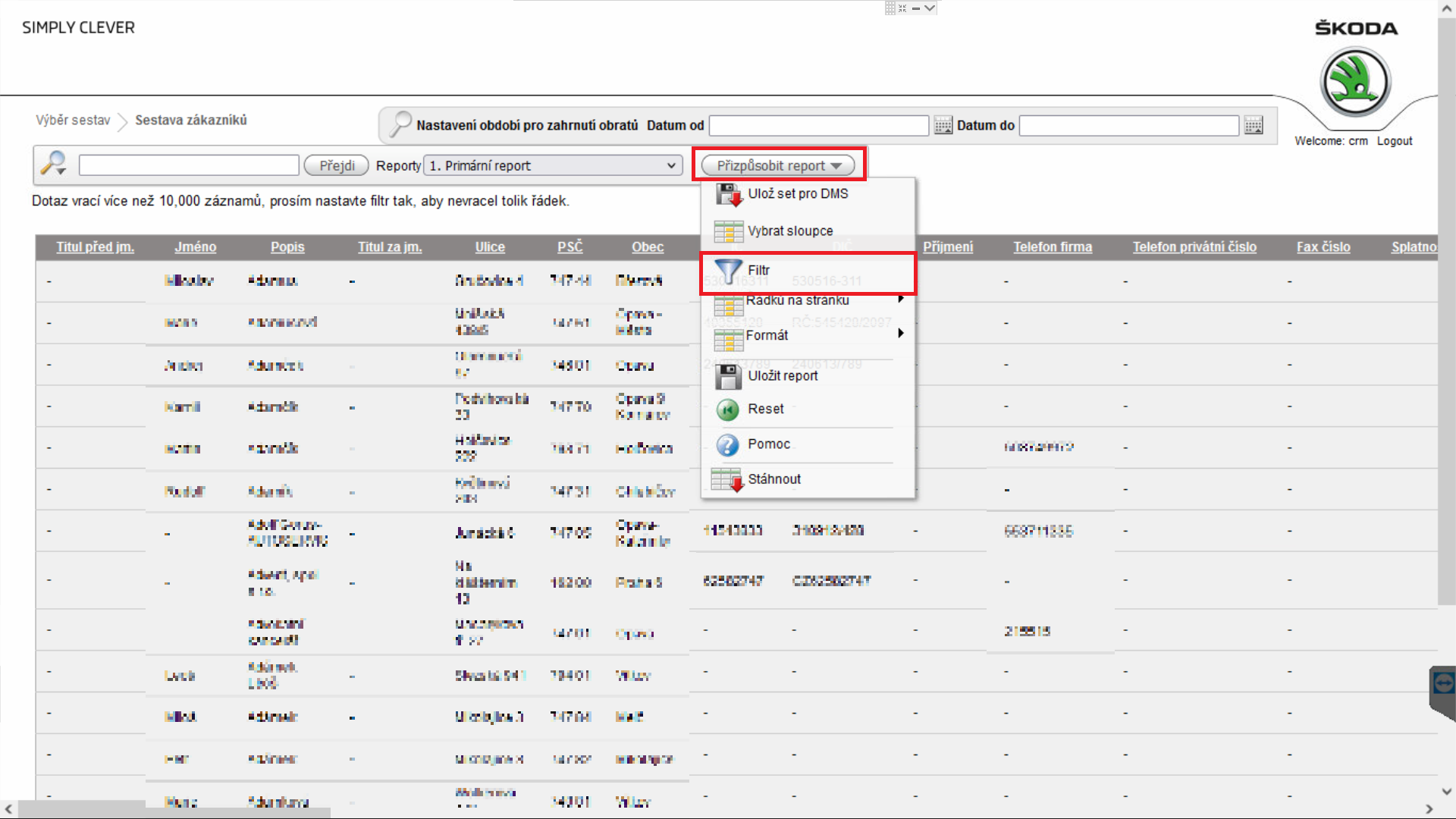 Pokud chcete vybrat údaje jenom za určité období, klikněte na „Přizpůsobit report“ a zvolte „Filtr“. Doporučujeme evidovat pro která období již export proběhl, a tím pádem exportovat pouze nová data (přírůstky), v zájmu urychlení.