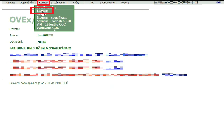 Na OVEX-u klikneme na záložku Komise a zvolíme pole Seznam.