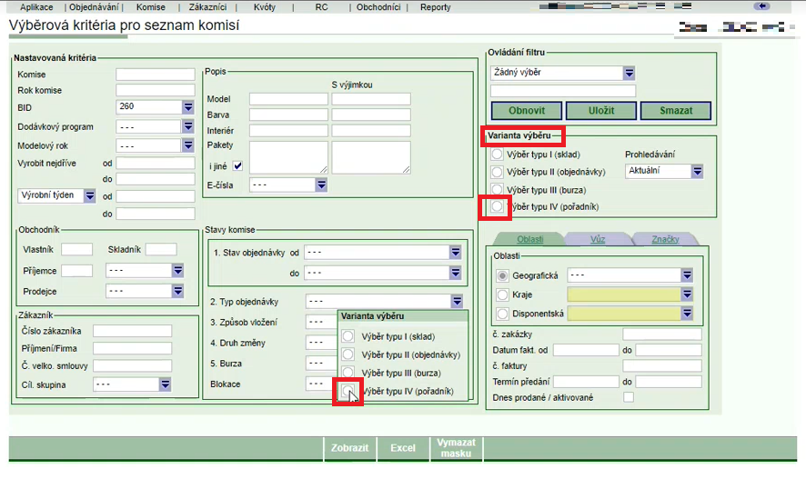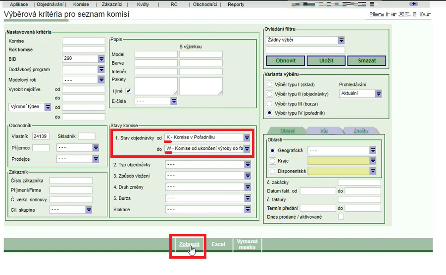 V tabulce Stav komise zvolíme první možnost - 1. Stav objednávky (od K – Komise v Pořadníku) (do W – Komise od ukončení výroby) a klikneme na tlačítko Zobrazit v dolní části stránky. Toto označení zvolí všechna vozidla.