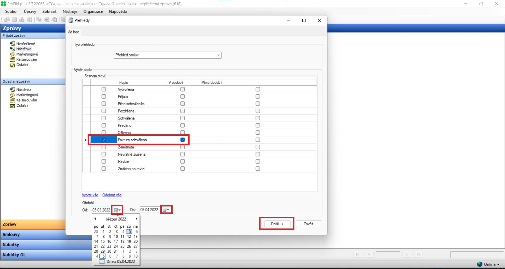 Dále si v nabízených možnostech najděte "Faktura schválena". Tuto možnost si označte podle obrázku níže. Dále si pomocí ikonky kalendáře můžete navolit období, a stiskněte tlačítko "Další".