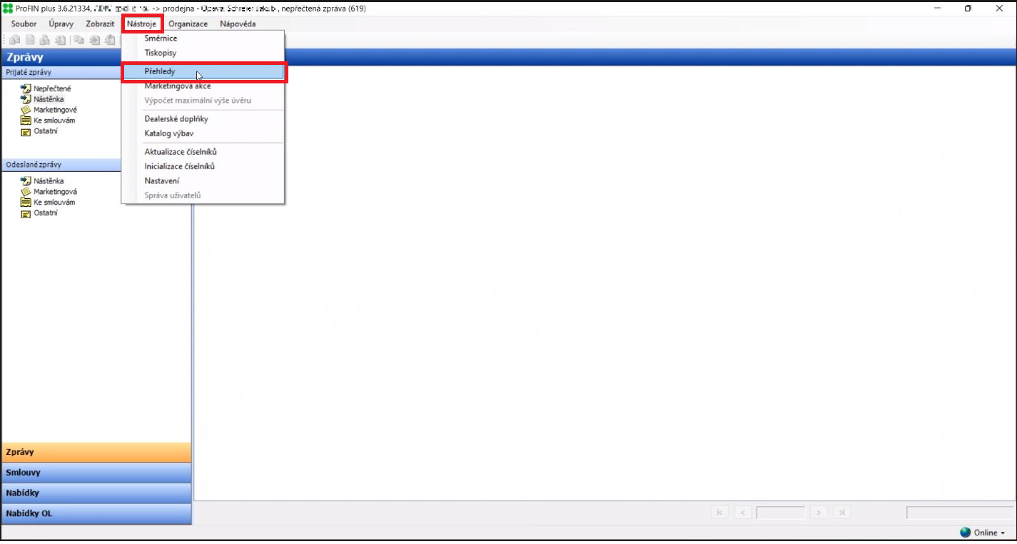 Stahování smluv probíhá v aplikaci Profin. Pokud ji máte otevřenou, tak můžete najet myší na horní menu na možnost "Nástroje". Z nových možností, které se vám objevili, zvolte "Přehledy".