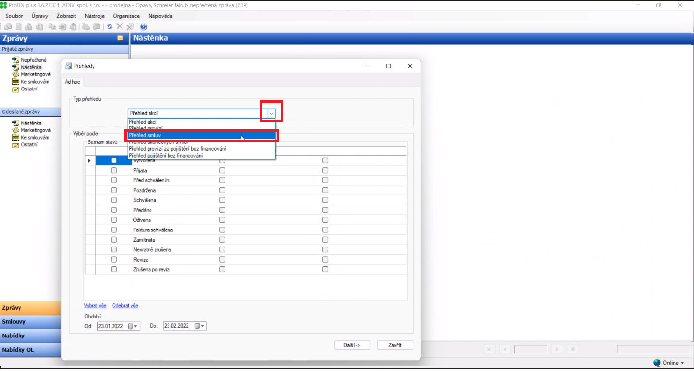 Otevřelo se vám nové okno zvané Přehledy. Šipkou v okně "Typ přehledu" si můžeteotevřít možnosti, a vybrat "Přehled smluv".