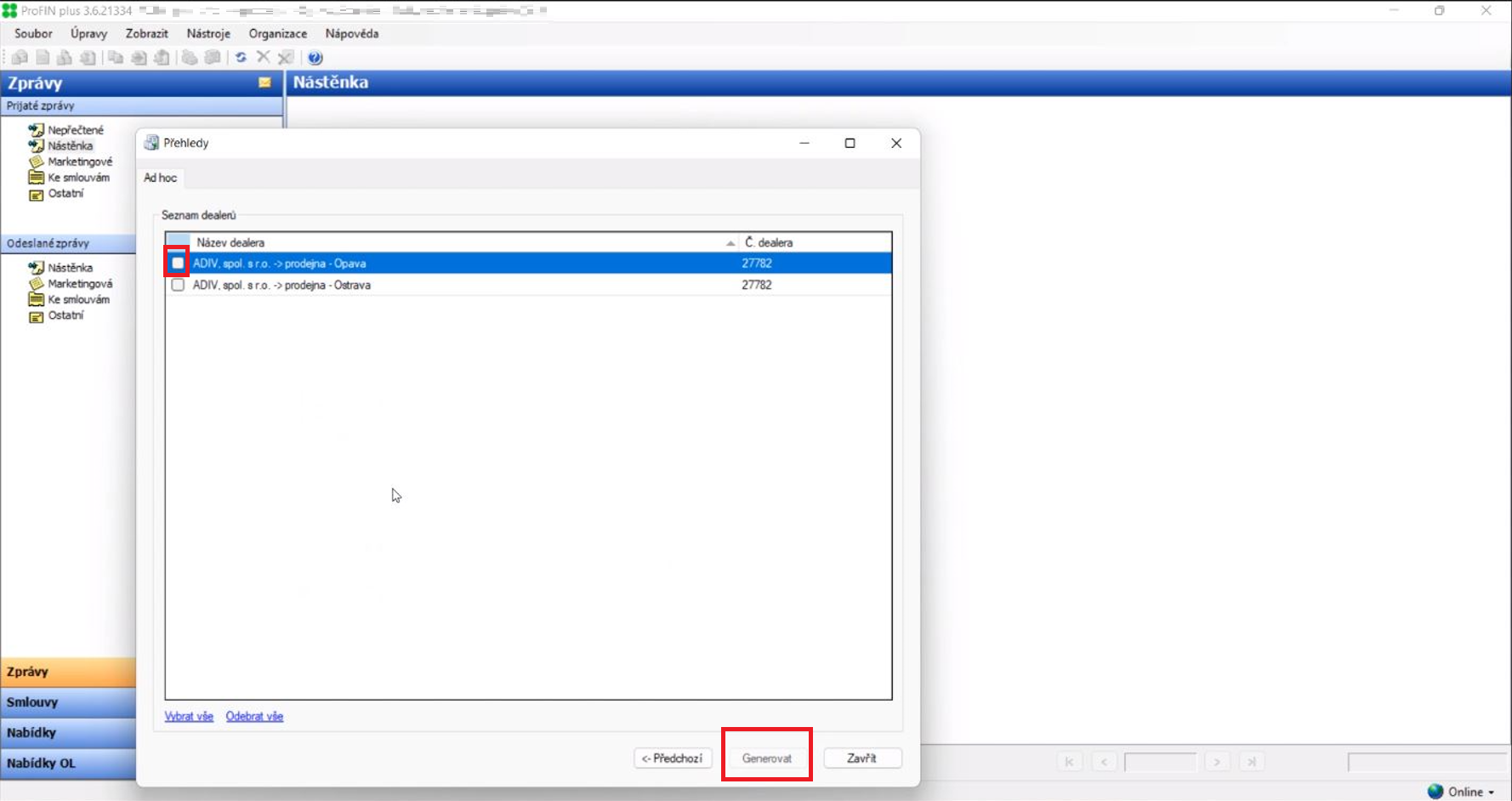 V posledním okně je nutné označit dealery, pro které se vygenerují smlouvy. Je možné, že se bude jednat o jednotlivé pobočky u jednoho dealera, a v tom případě je nutné zakliknout každou pobočkNa závěr stačí stisknout tlačítko "Generovat".