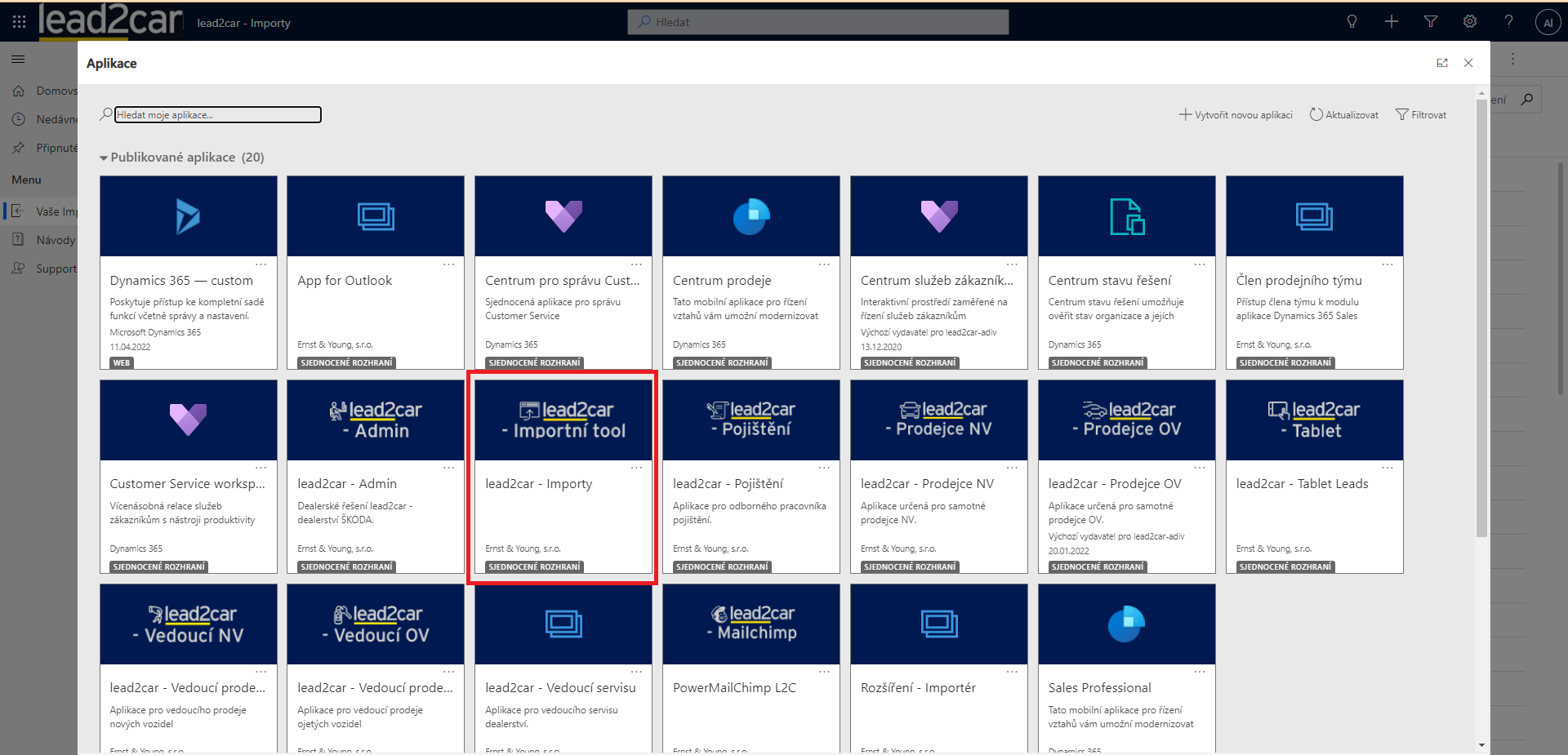 Pro nahrání členů marketingového seznamu do Lead2Car je třeba nejprve přejít do aplikace importy.