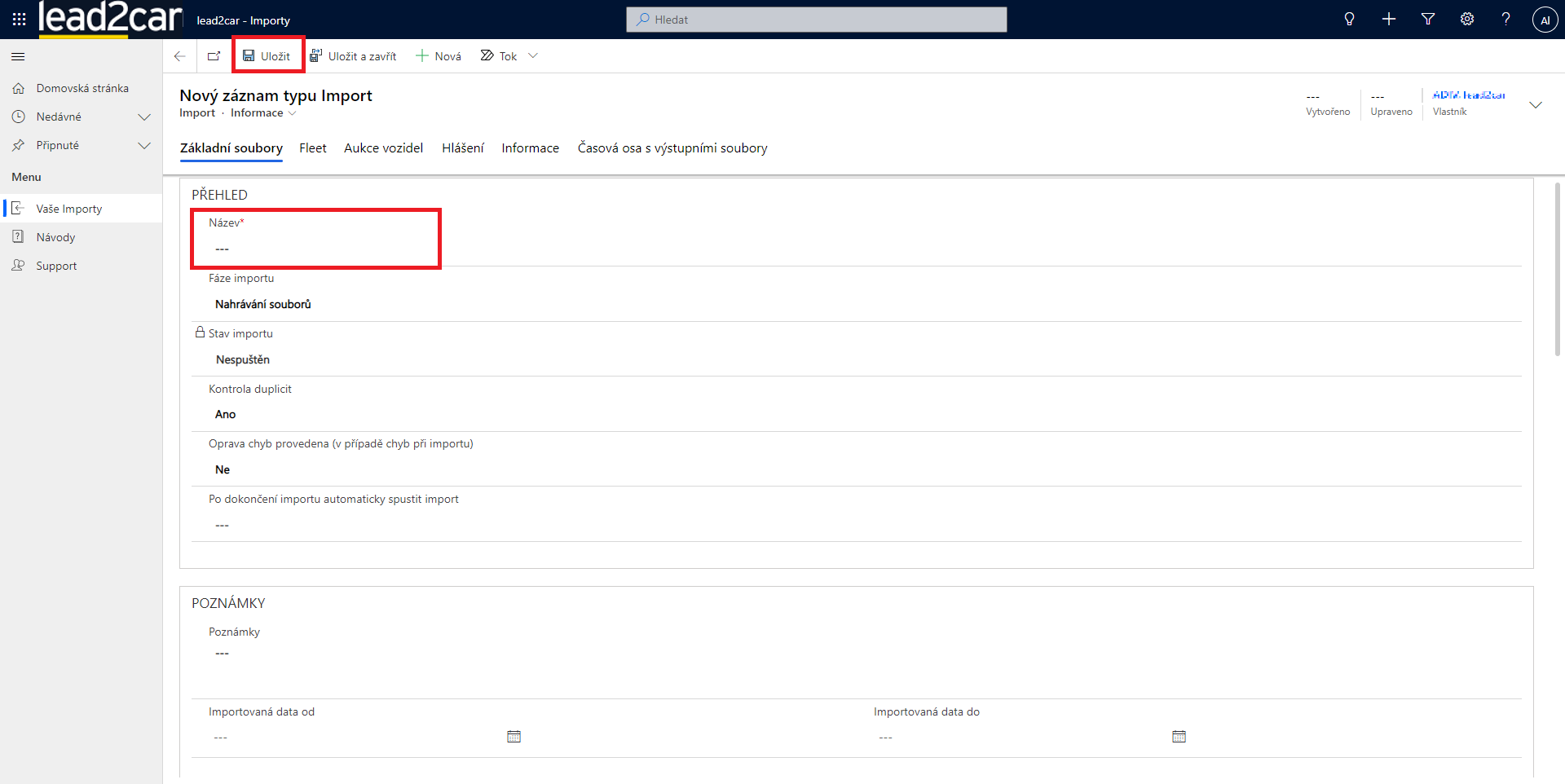 Nahoře pomocí zeleného tlačítka + Nová otevřeme formulář pro nový import. Na záložce základní soubory je nejdříve třeba vyplnit název importu, jakmile vyplníme název, klikneme na tlačítko uložit v horní liště.
