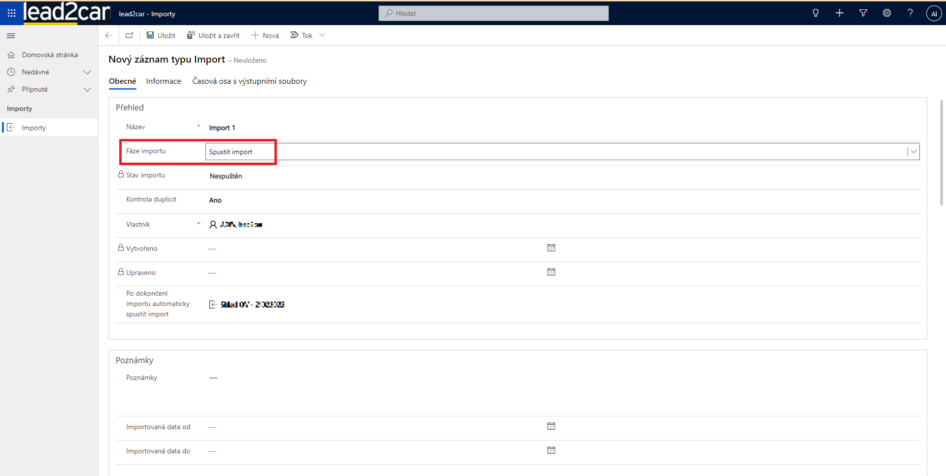 Pro spuštění importu zvolte ve „Fáze importu“ možnost „Spustit import“ a záznam uložte. Po spuštění se všechna pole uzamknou, nejde měnit ani název importu.